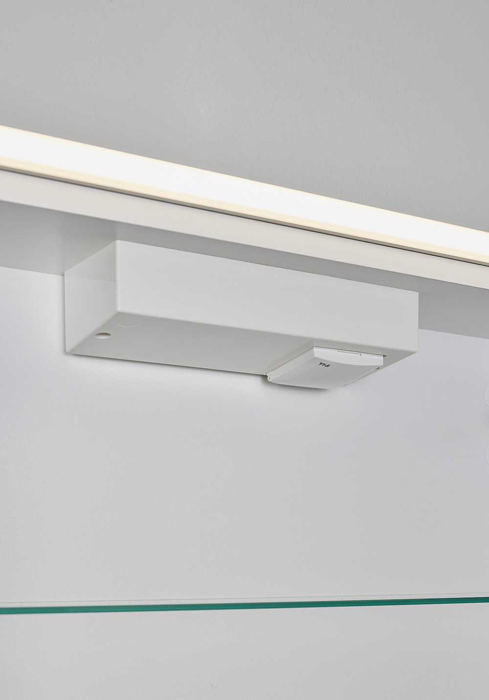 Electrical box with electrical outlet for mirror cabinets. In the electrical box, electricity from the wall and lighting can easily be connected while the cabinet is on the wall. If necessary, the box can accommodate a transformer. Suitable for the Hafa Go Basic mirror cabinet, which is prepared for installation of this electrical box.
