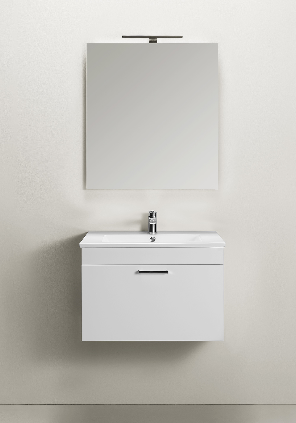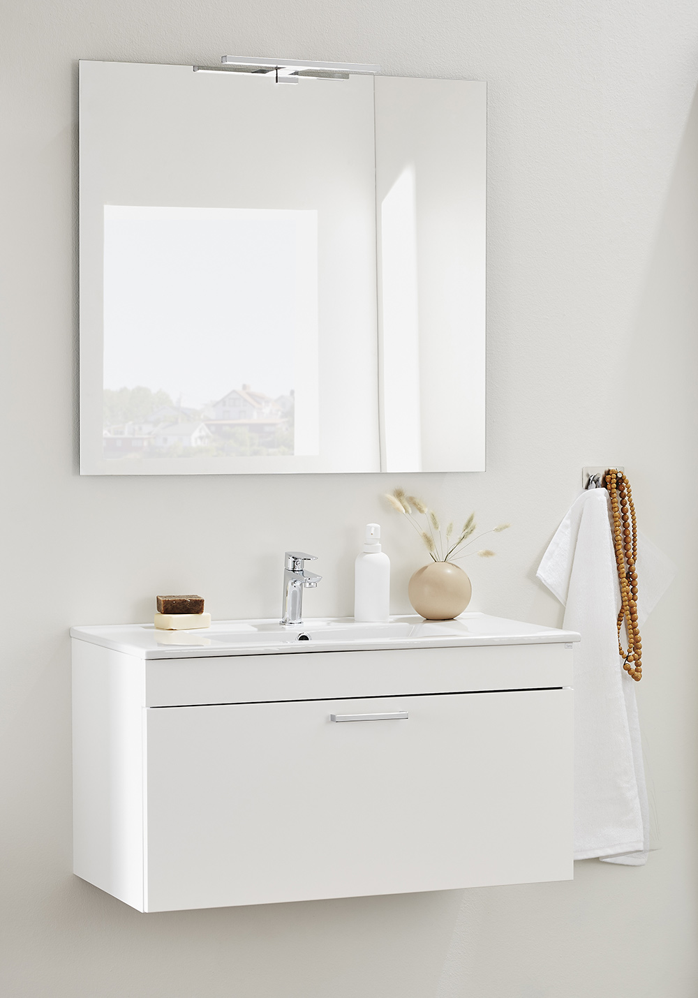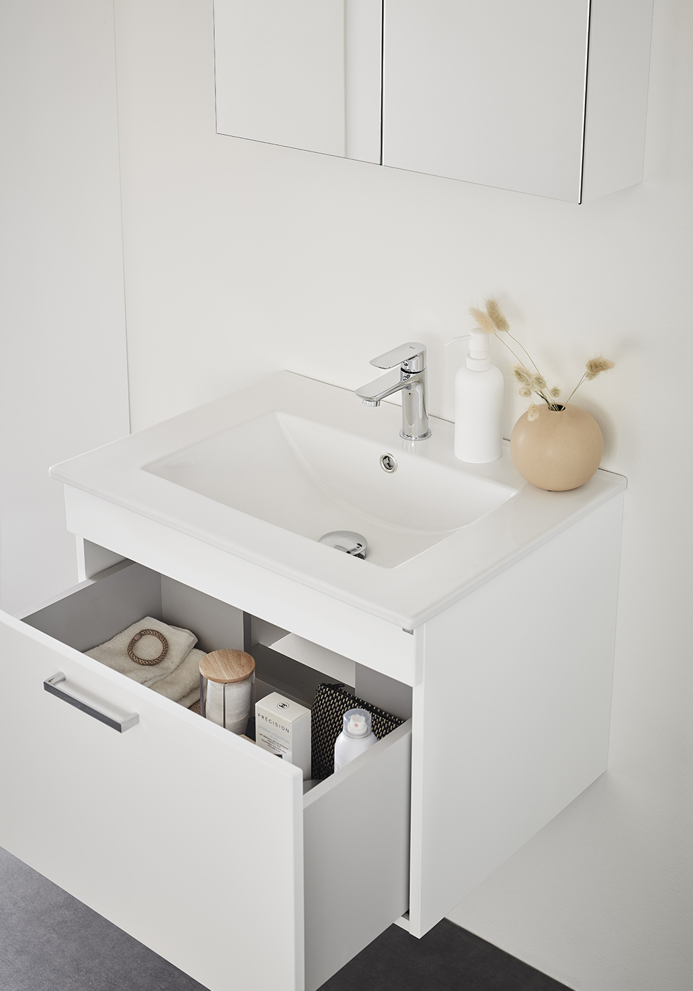 Basin vanity unit with soft-close drawer that provides generous storage. Including washbasin and mirror. Easy for just one person to install on a rail on the wall. Prepared for both wall and floor drains in the back edge for easy installation. Adjustable hanging brackets. Add a PUM water trap designed for vanity units, 126 50 00 and Go LED-light. Add your own personal style with one of our handles or knobs.