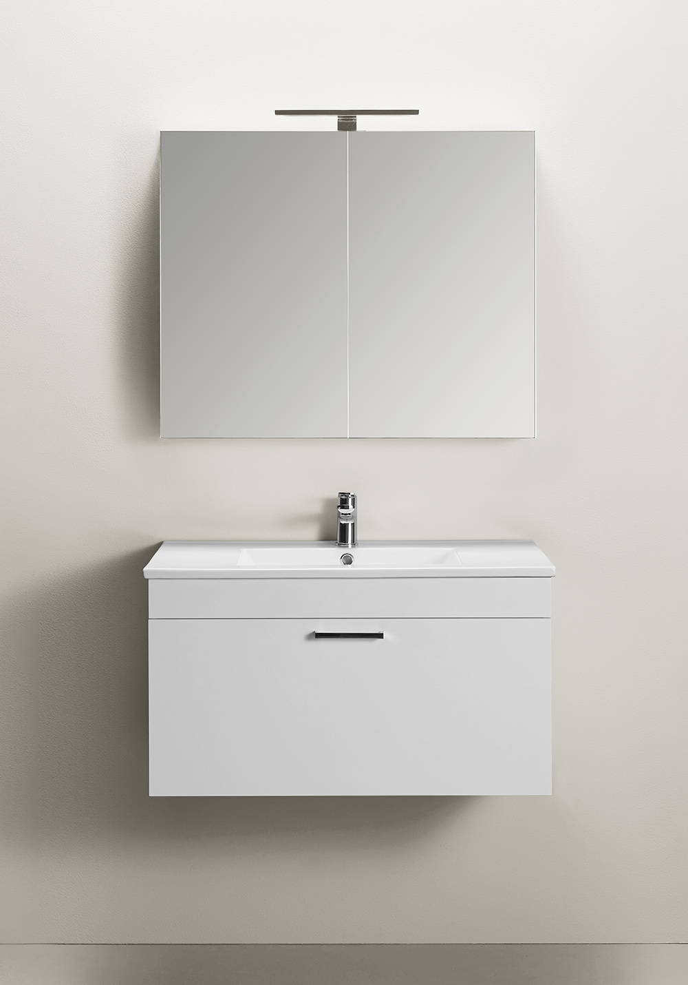 Hafa Go washbasin cabinet with soft-close drawer, recessed sink and mirror cabinet. The vanity unit is easy to install for one person with a rail on the wall. Prepared for both wall and floor drains in the rear for easy installation. Adjustable suspension fittings. Mirror cabinet with double-sided mirrored doors and height-adjustable glass shelves. The mirror cabinet is easily mounted on a rail on the wall. Complete with PUM water trap 1265600 and Go LED lamp 1267270. Personalise your style with one of our handles.