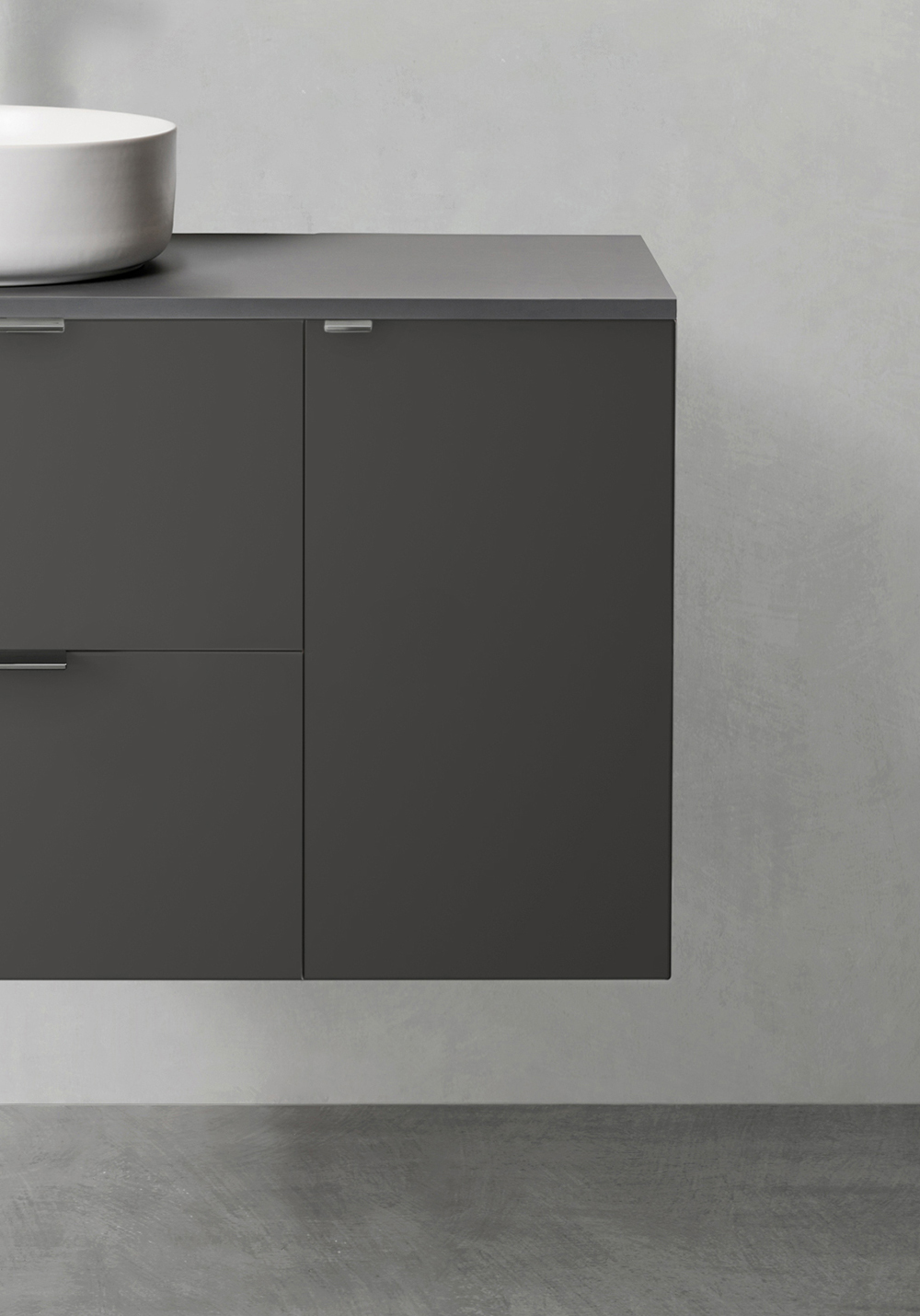 Combine your vainty cabinet with Hafa Shape side cabinet for fither widths and configurations. Inside the cabinet is a shelf. The side module and its hatch can be mounted on right or left hand side. Choose between SoftClose or push-open hatch. For your SoftClose option, choose one of our handles or knobs.