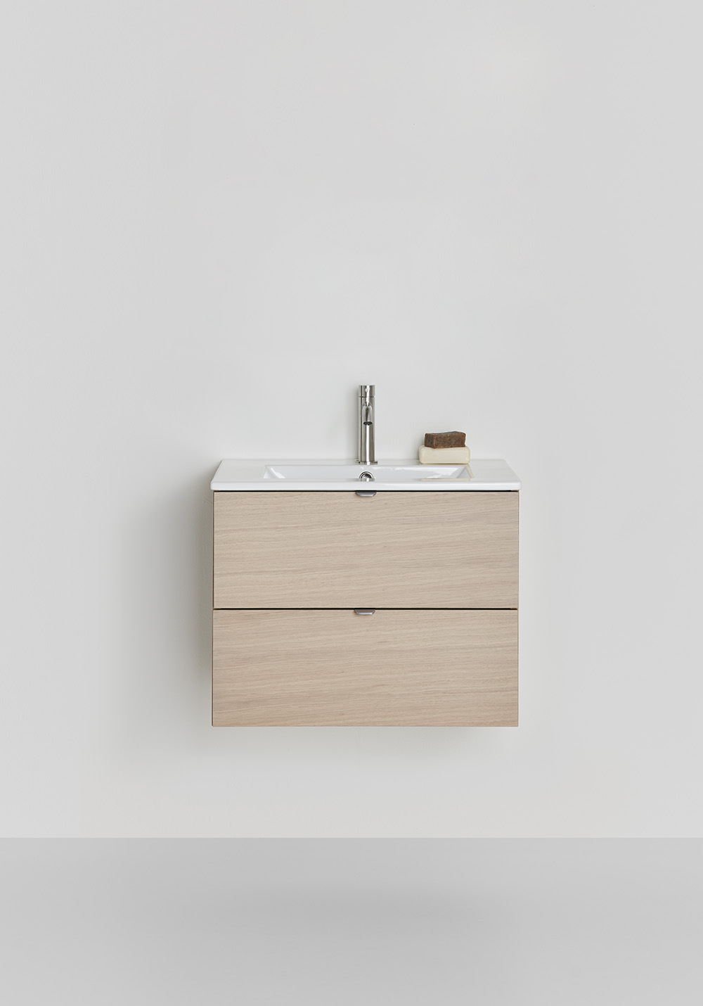 The Hafa Go vanity unit with porcelain washbasin is a practical and stylish piece of bathroom furniture with smooth fronts and the opportunity for you to set your own style by adding one of our handles. Two soft-close drawers with full extension provide a good overview of the contents. The Hafa Go bathroom cabinet comes in several different sizes and colours, either with a matt lacquered finish or a matt lacquered oak veneer finish. The bathroom cabinet is pre-assembled and easy to install with a wall rail and adjustable hanging brackets and space prepared for both wall and floor drains. The washbasin has overfill protection and ample storage space. Buy a handle, mixer tap, bottom valve, water trap and electrical outlet.
