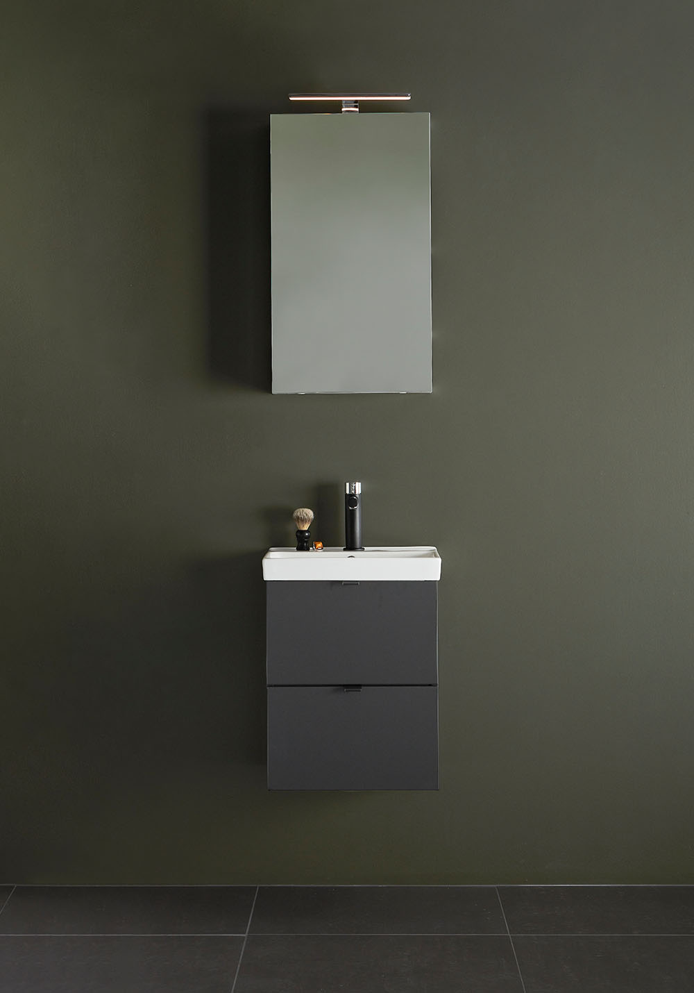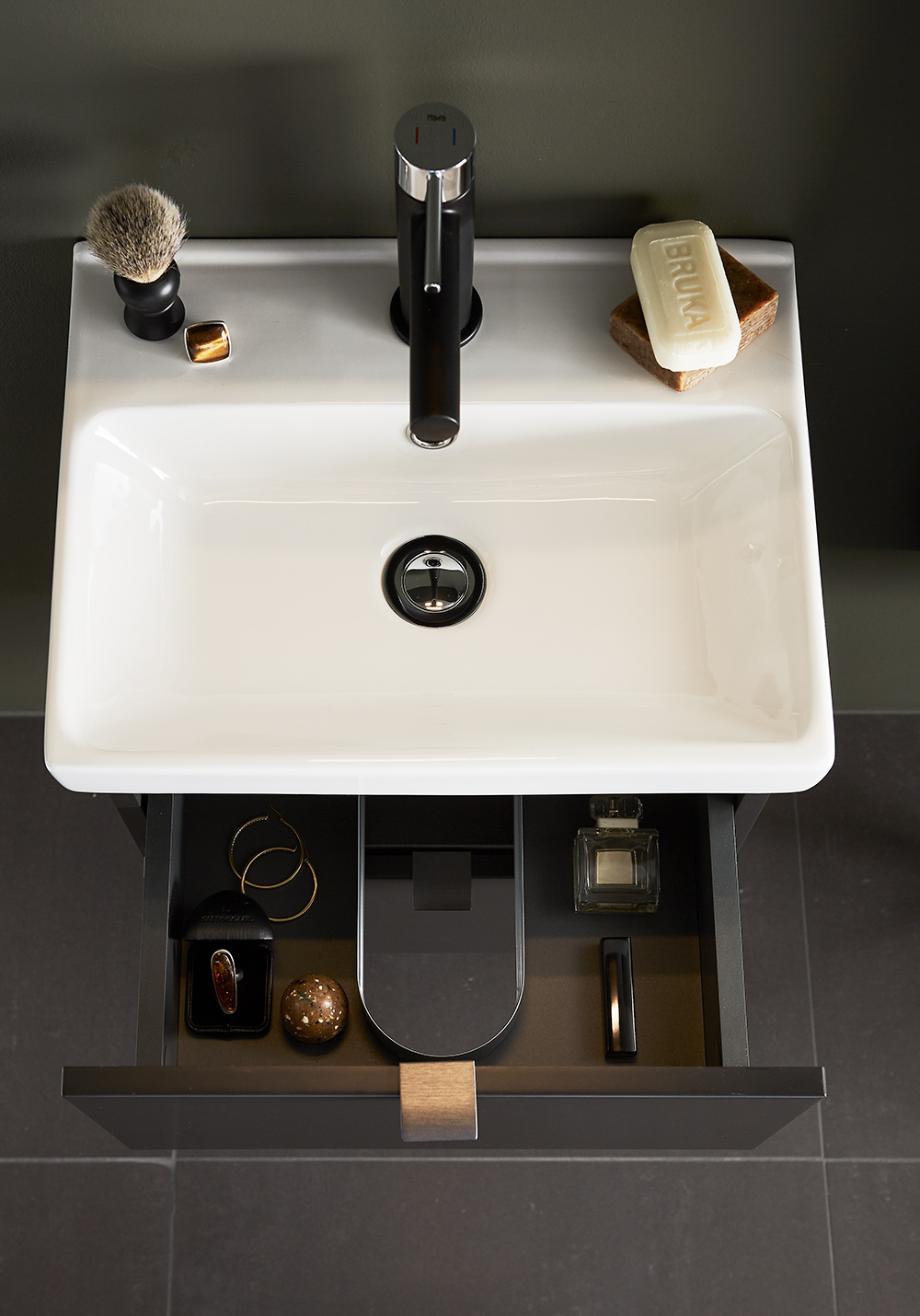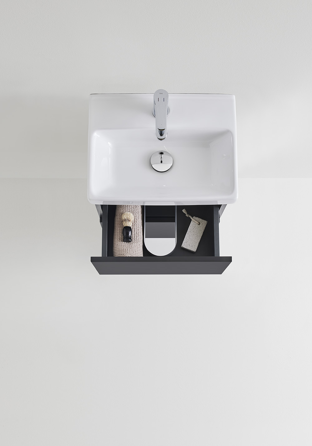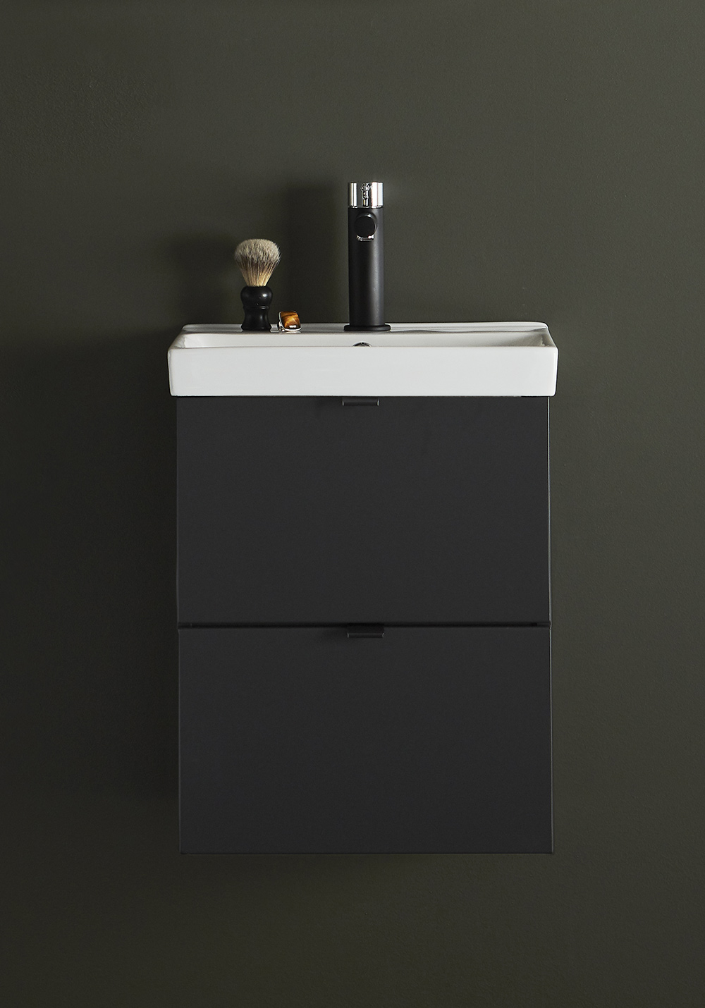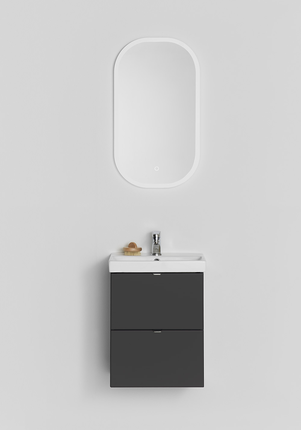 Hafa Neat is a practical and small-space fitting vanity unit. Complete with Hafa Neat basin. The cabinet has Soft-Close function and is easy install for one person, with a rail and adjustable suspension brackets. The cabinet is prepared with room for both floor and wall drain at the back for easy installation and is furthermore ready mounted. Complete the unit with Hafa Neat basin, handle, pop up valve and waste trap. We do not recommend a mixer with waterfall spout in combination with this basin.