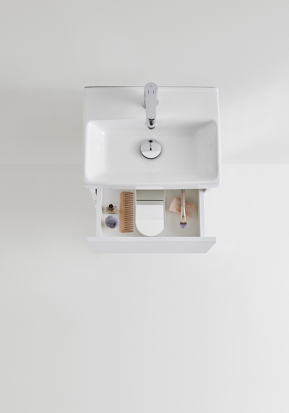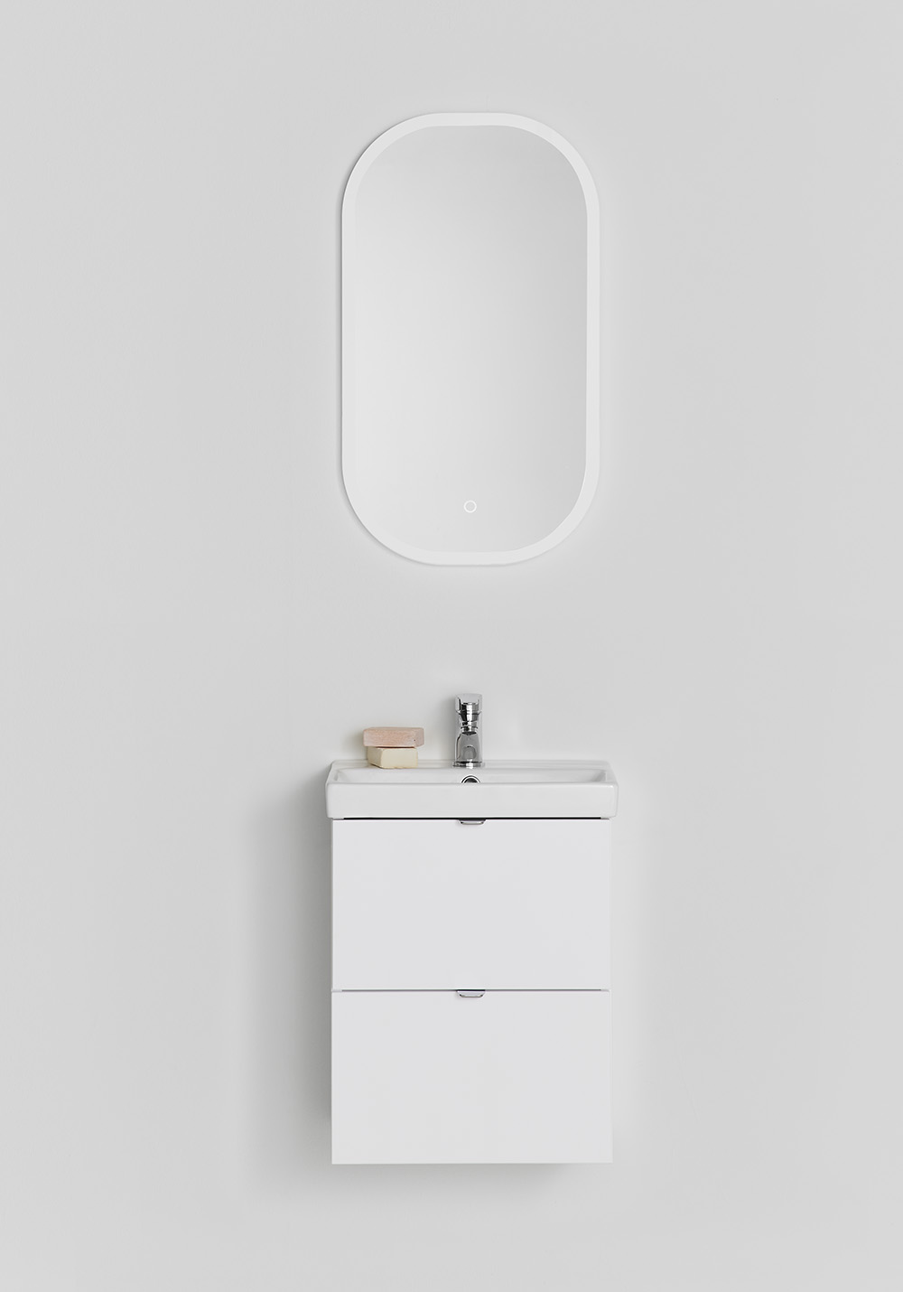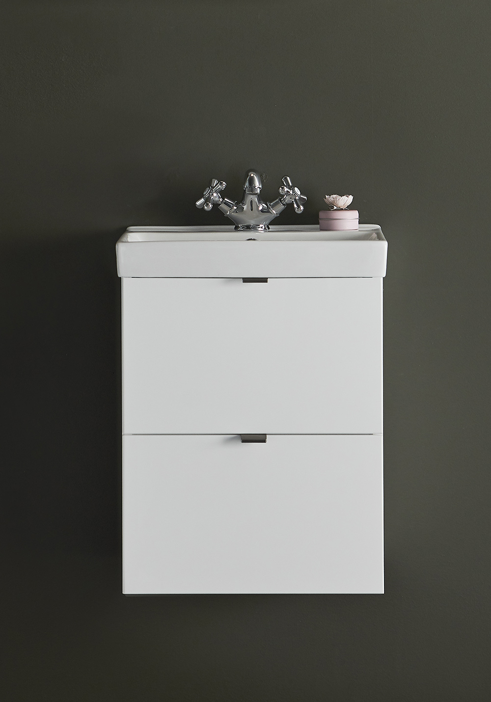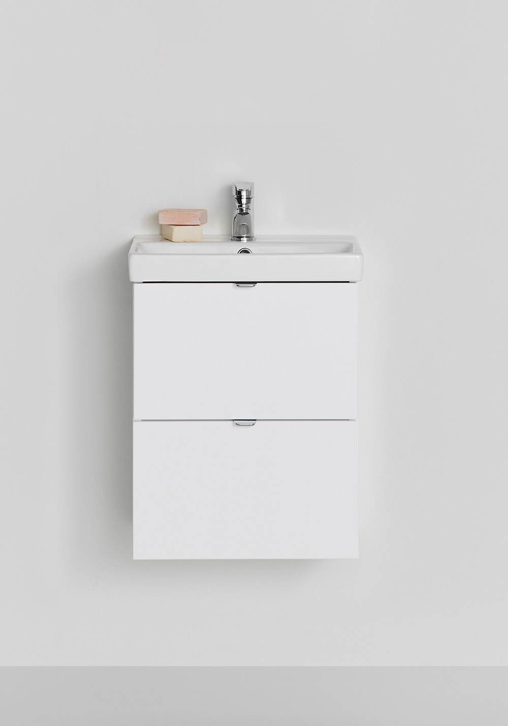 Hafa Neat is a practical and small-space fitting vanity unit. Complete with Hafa Neat basin. The cabinet has Soft-Close function and is easy install for one person, with a rail and adjustable suspension brackets. The cabinet is prepared with room for both floor and wall drain at the back for easy installation and is furthermore ready mounted. Complete the unit with Hafa Neat basin, handle, pop up valve and waste trap. We do not recommend a mixer with waterfall spout in combination with this basin.