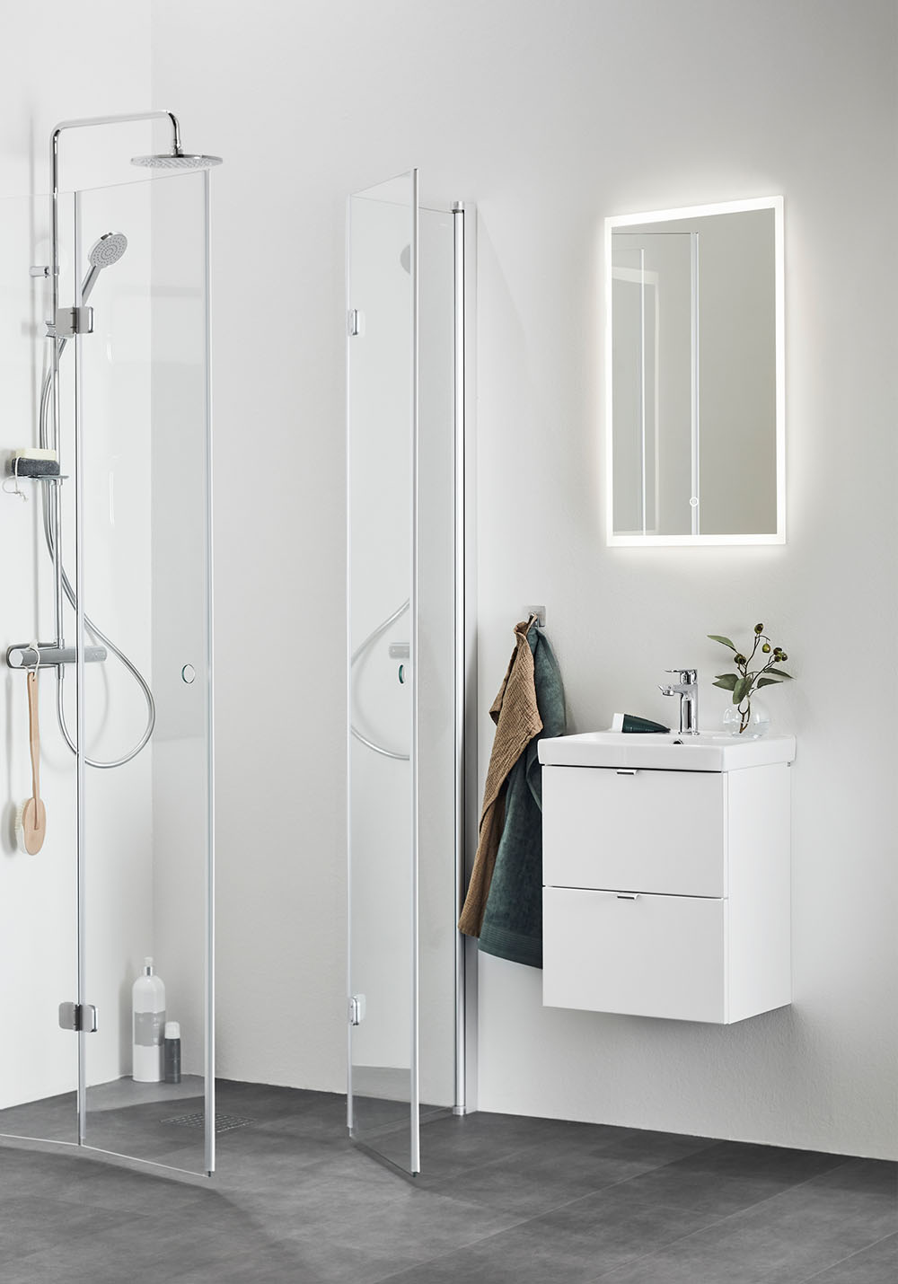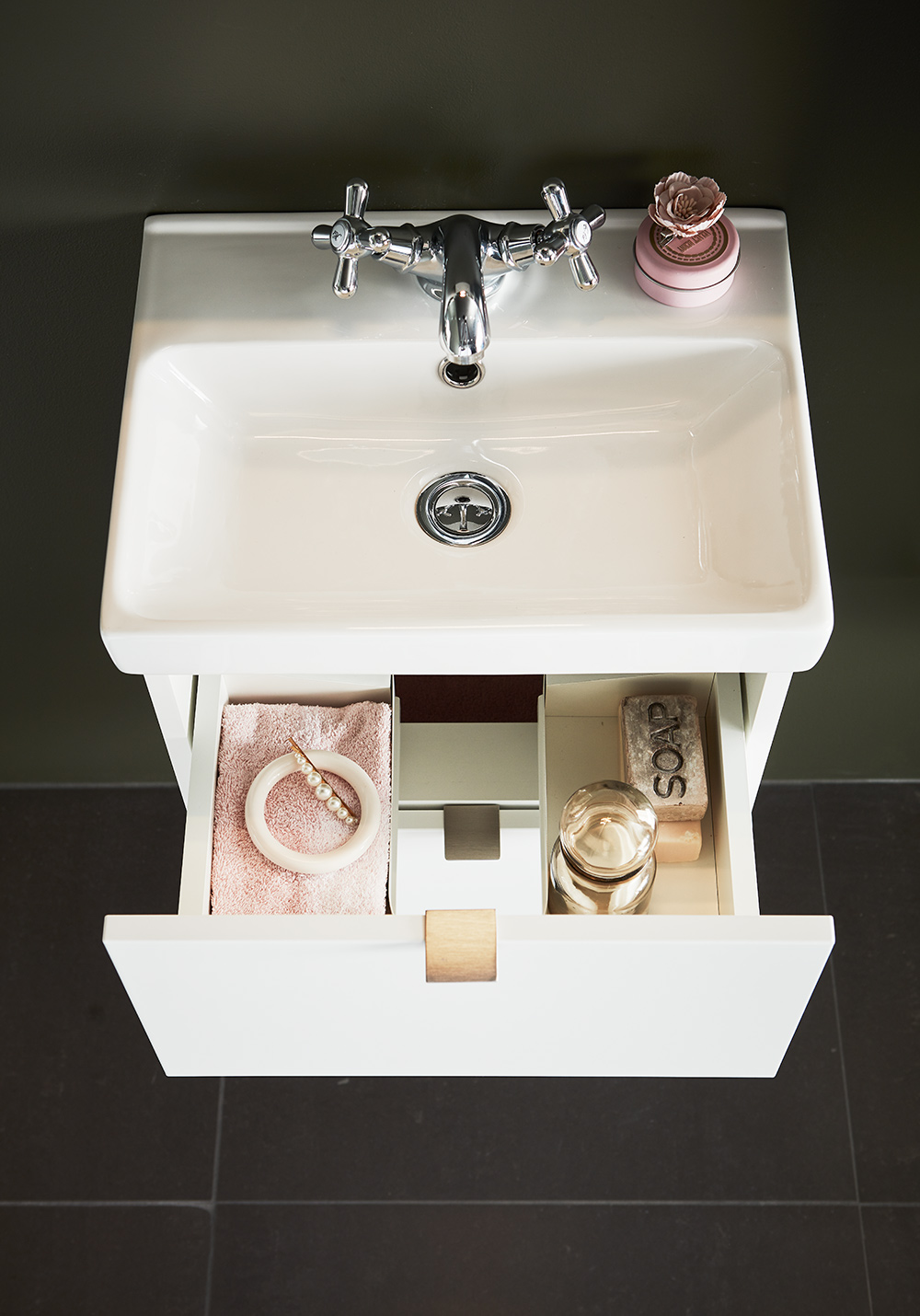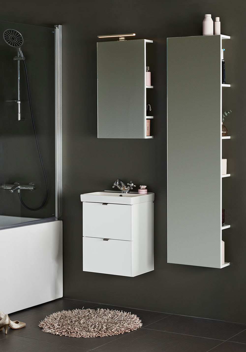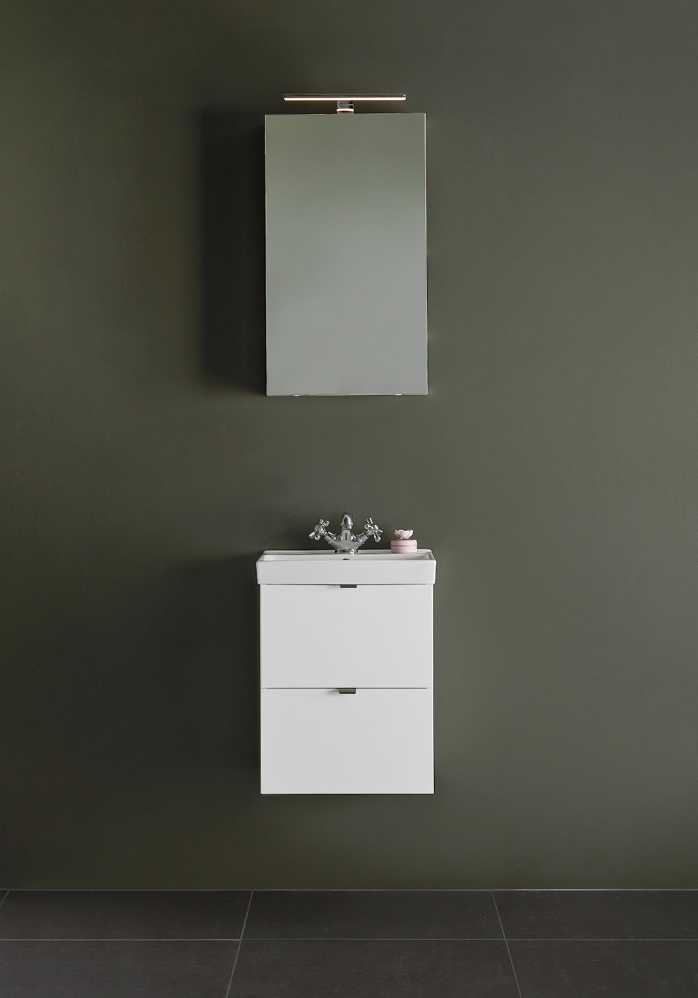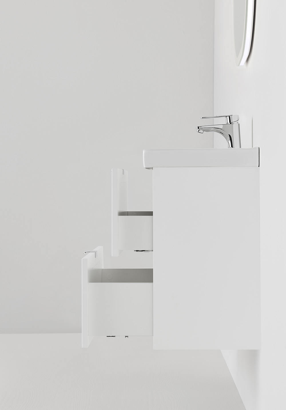 Hafa Neat is a practical and small-space fitting vanity unit. Complete with Hafa Neat basin. The cabinet has Soft-Close function and is easy install for one person, with a rail and adjustable suspension brackets. The cabinet is prepared with room for both floor and wall drain at the back for easy installation and is furthermore ready mounted. Complete the unit with Hafa Neat basin, handle, pop up valve and waste trap. We do not recommend a mixer with waterfall spout in combination with this basin.