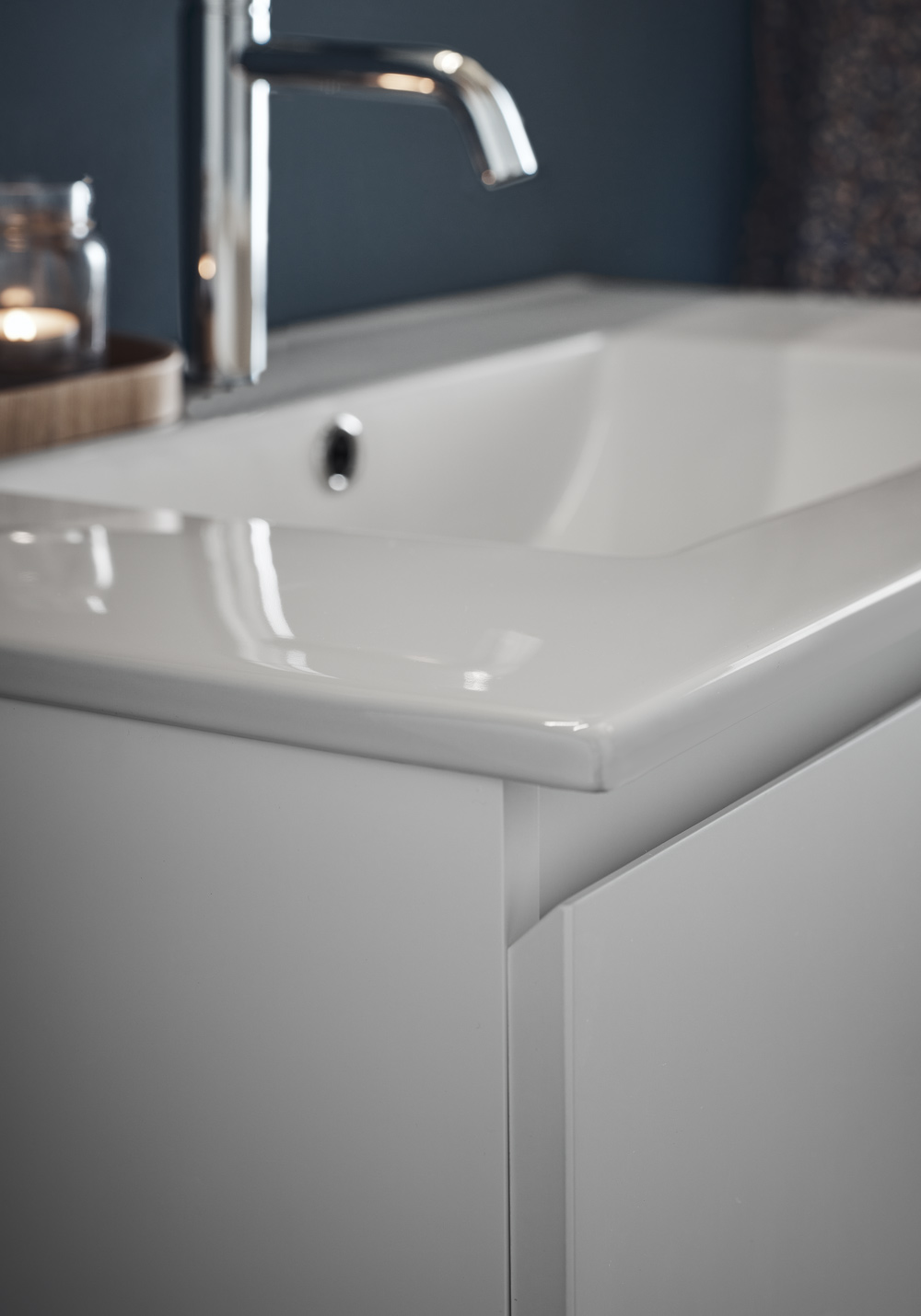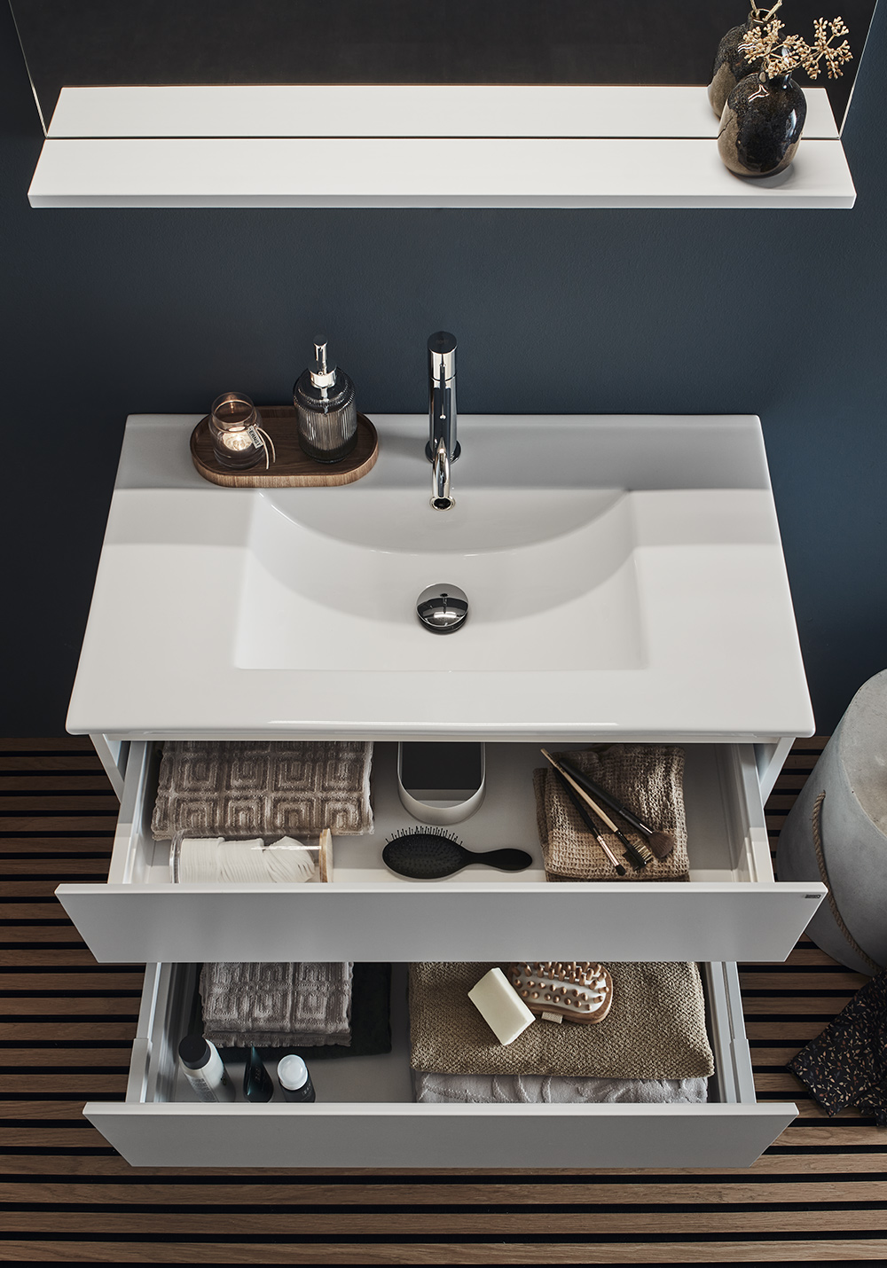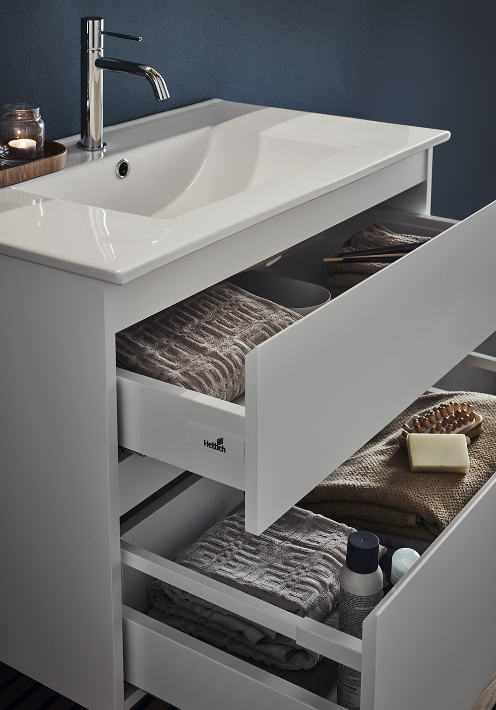 - The Hafa Style vanity unit has integrated handles, giving it a clean and modern look. The bathroom furniture's two drawers have soft-close and full extension, so you can easily reach everything in them. Complete with washbasin, mixer tap, bottom valve, water trap and electrical outlet.