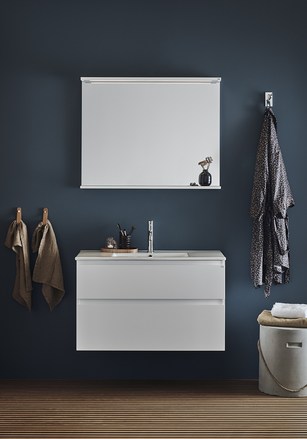 Under cabinet Hafa Style bathroom cabinet is available in widths 600, 800, 1000 and 1200 and in the colours lacquered white matt and beautiful patterned surface of oak or brown oak. The bathroom cabinet is easy to install with a wall rail and adjustable suspension fittings. It is also prepared for both wall and floor drains.