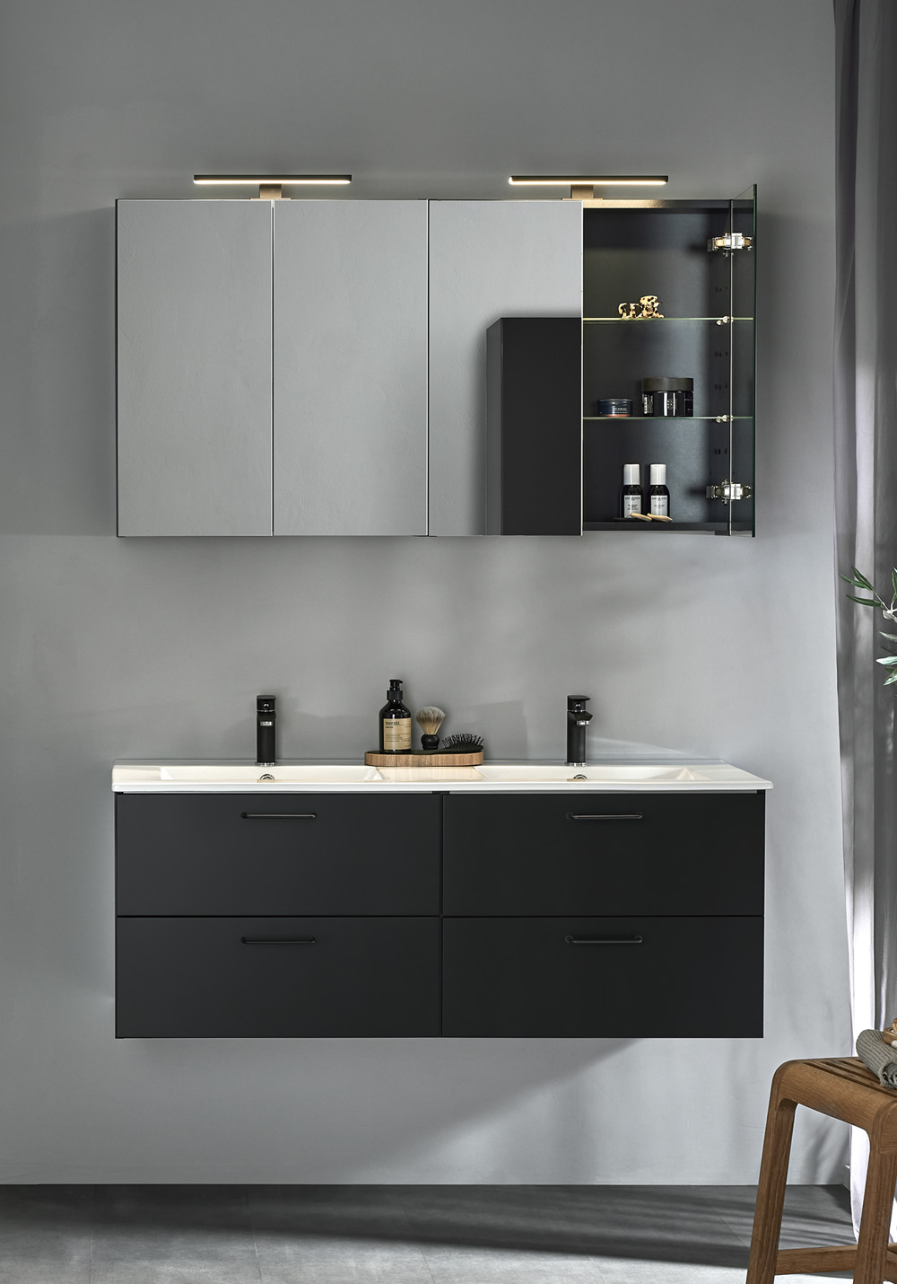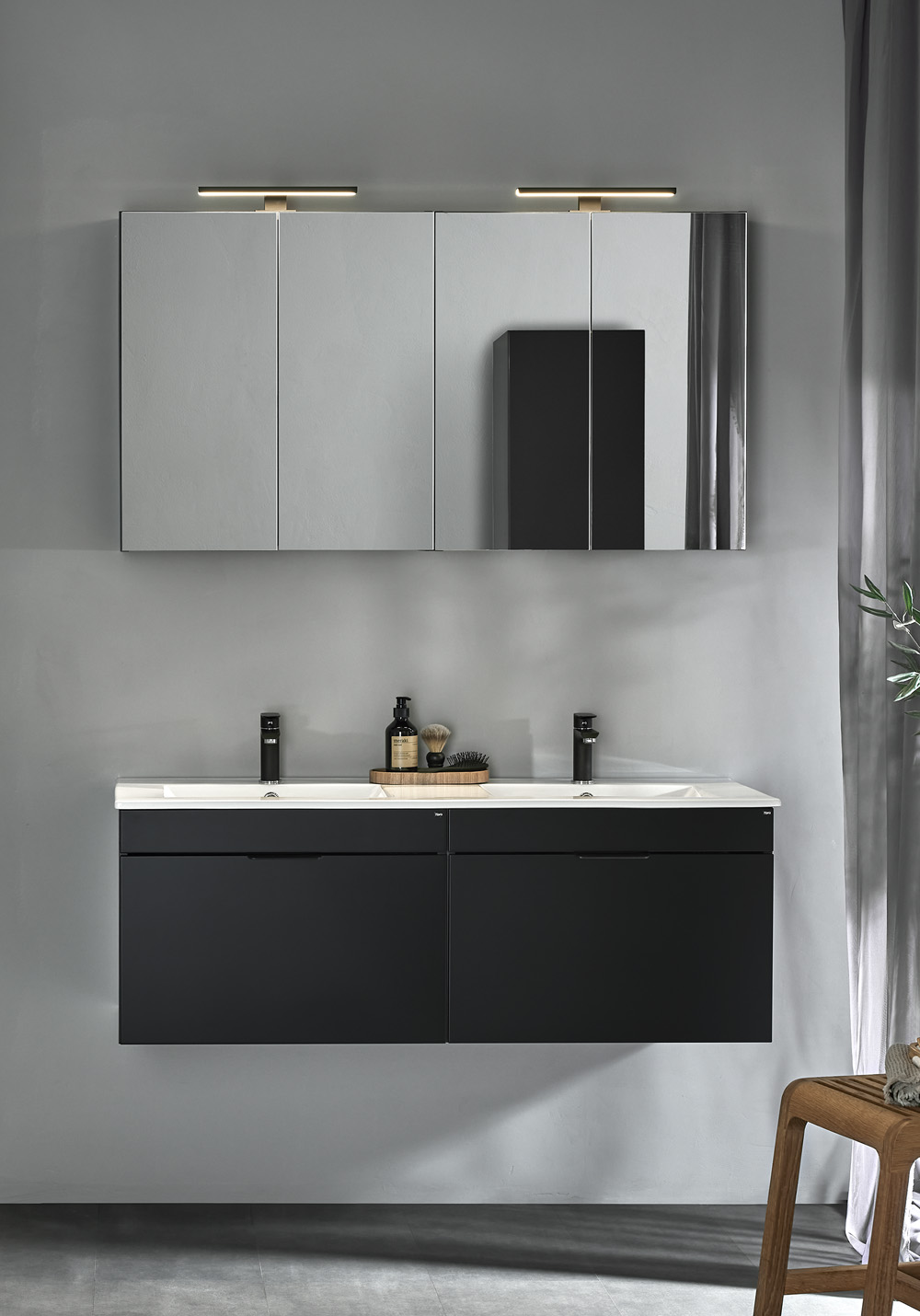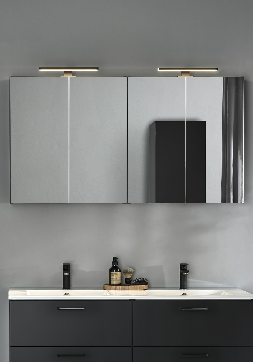 The Hafa Go mirror cabinet is a practical cabinet with plenty of storage space. With double-sided mirrored doors and glass shelves inside that can be adjusted in height. The mirror cabinet is easily mounted on a rail on the wall, making it easy for one person to install. With adjustable suspension fittings. Available in several widths and colours. Add Go LED lamp 1267270 and electrical outlet 1267265.