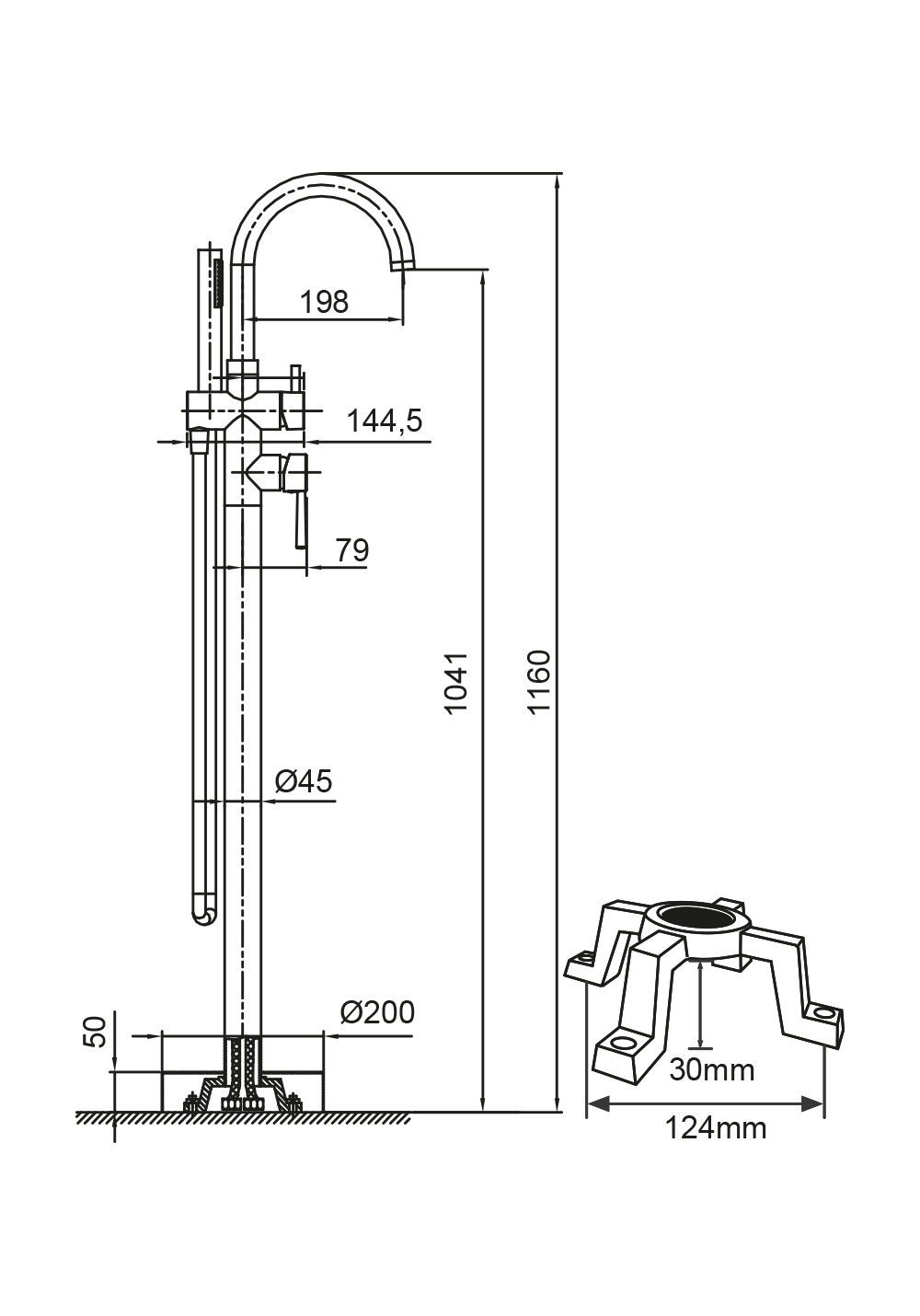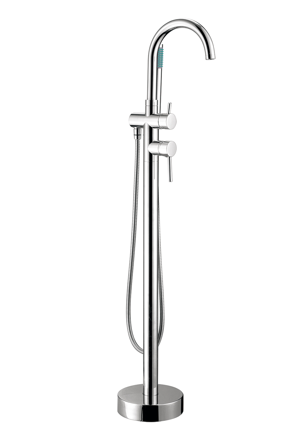 Freestanding floor mixer that goes perfectly with bathtubs freely placed in the bathroom. Height 1160 mm. The mixer should be mounted on a plinth.