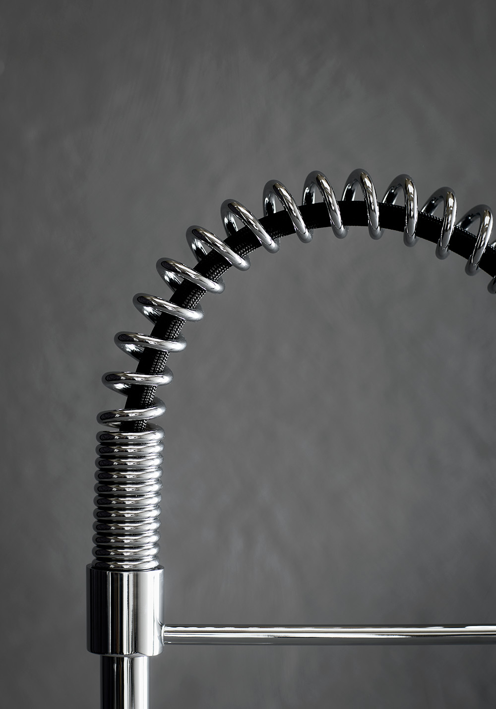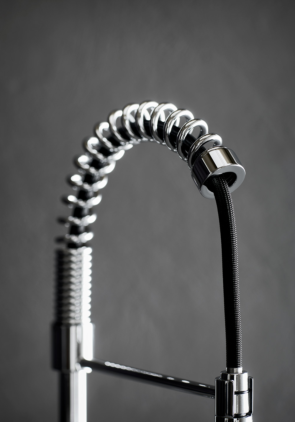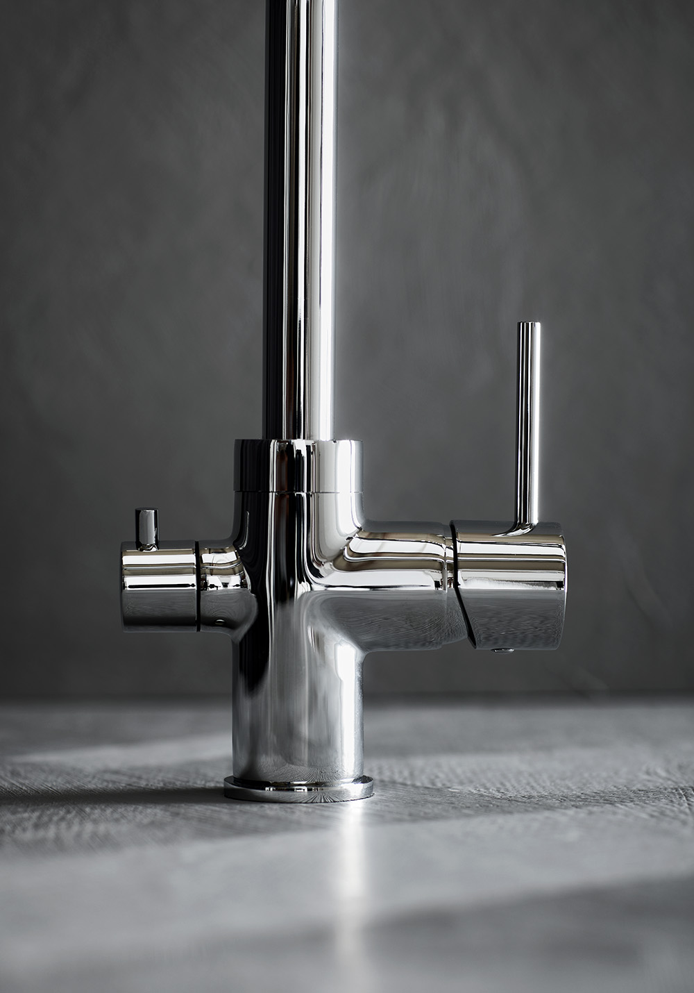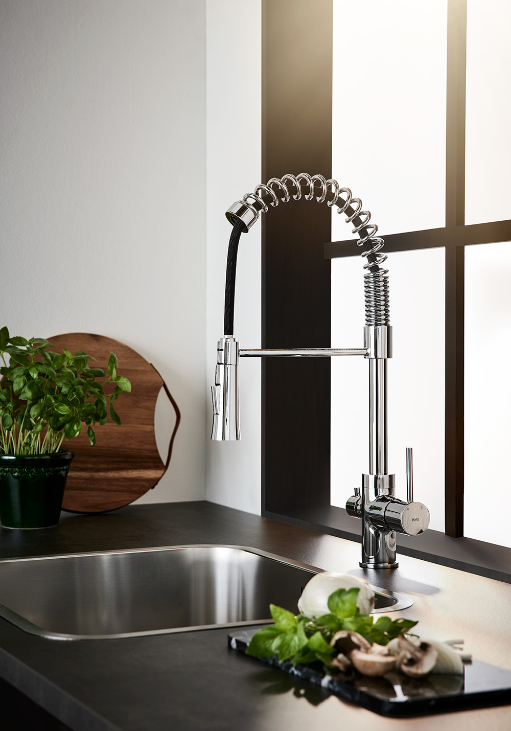 Kitchen mixer Dine of brass with dishwasher shut off has a modern design for you who seeks the modern industrial or bistro style in your kitchen. Swayable spout with possibility to restriction at 70, 110 or without (360 degrees). With EasyMount, tool-free fixation. Available in colours chrome, black matt, and brushed brass. The surface keeps its beautiful colour over time. Assessed and certified by SINTEF.