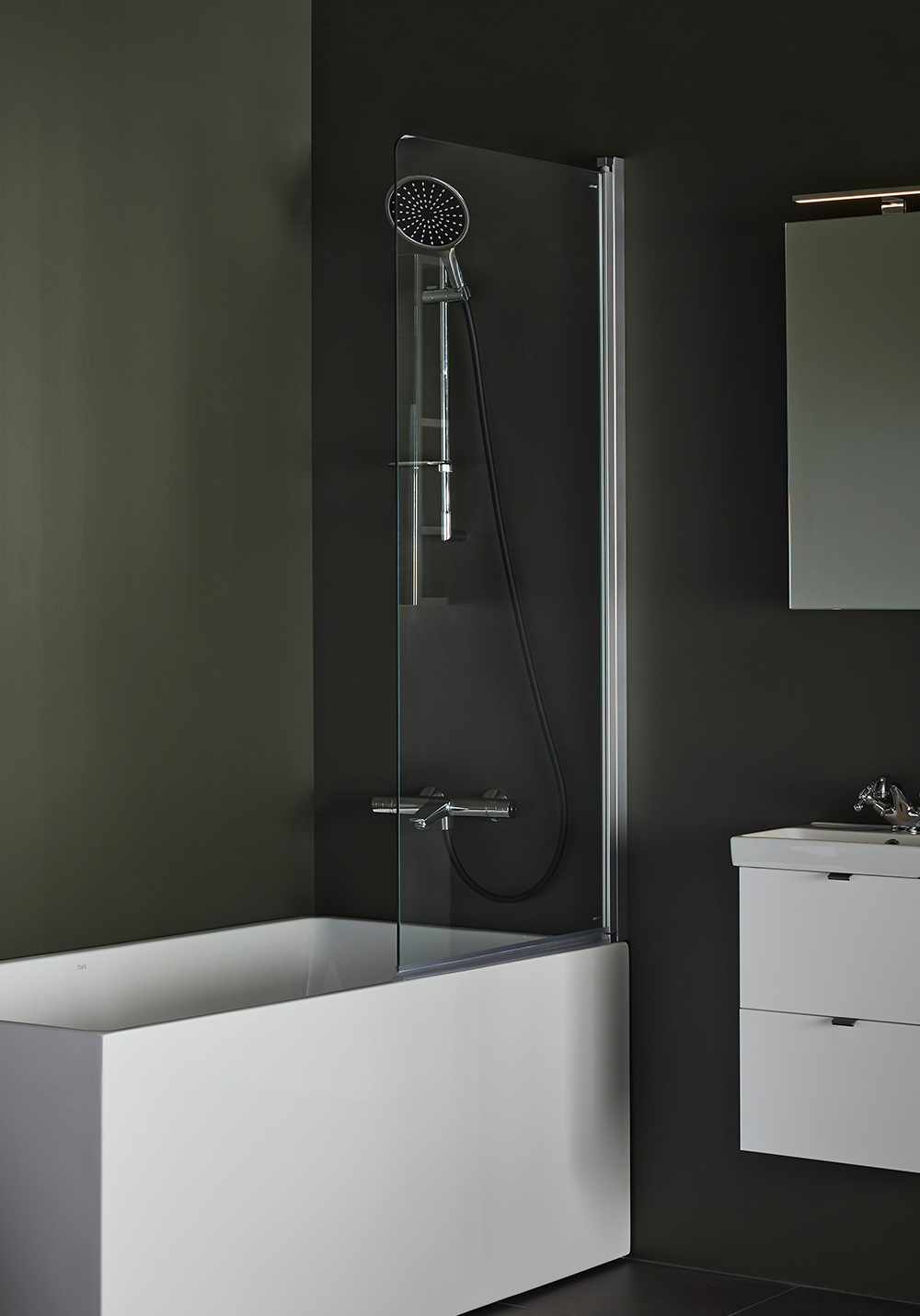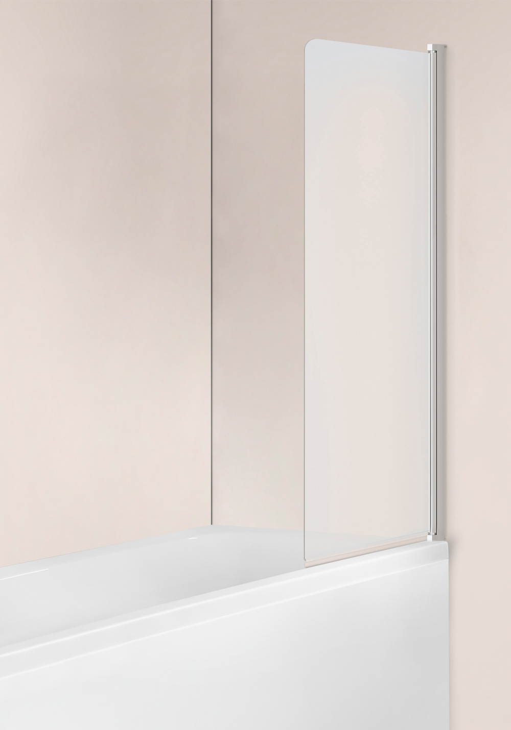 Pivotal bathtub screen with glueable profile in aluminum for wall mounting. 6 mm toughened safety glass. Lifting hinges. Height1500 mm. Insatalled against solid ground. Can be fitted with 12 mm surface-mounted pipes cc 35 mm. Extension profile is available for surface-mounted piping. 22 mm door seal included.