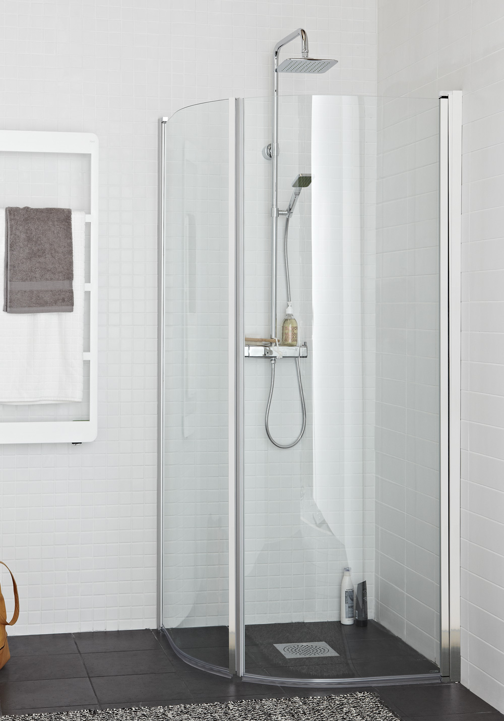 Modern and slightly curved shower door with elegant chrome profiles. Integrated magnetic door seal in the longitudinal handle profile. Smart construction with lifting hinge that lifts the doors 3 mm when opening so that they do not touch the floor when opening. When the shower is not in use the doors are easily turned inwards which frees up space in the bathroom. The shower corner is available in sizes 700, 800 and 900 mm and can be combined into six different variants, for example 700x900, 800x800 and so on. Height 2000 mm. Can be mounted with surface-mounted pipes, 35 mm. 20 mm door seal included.