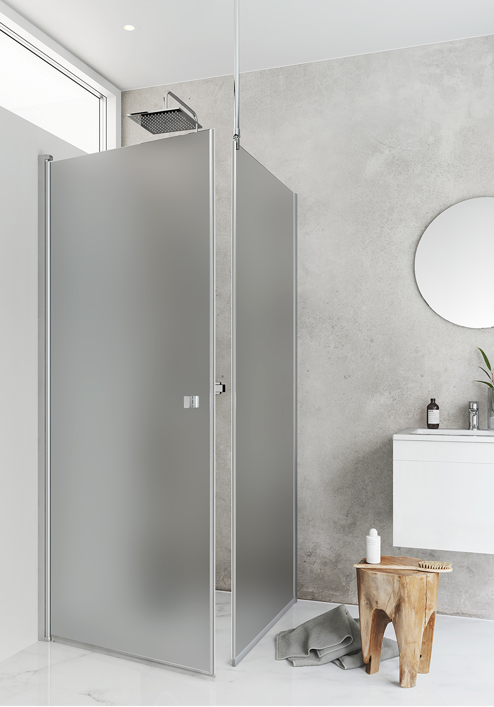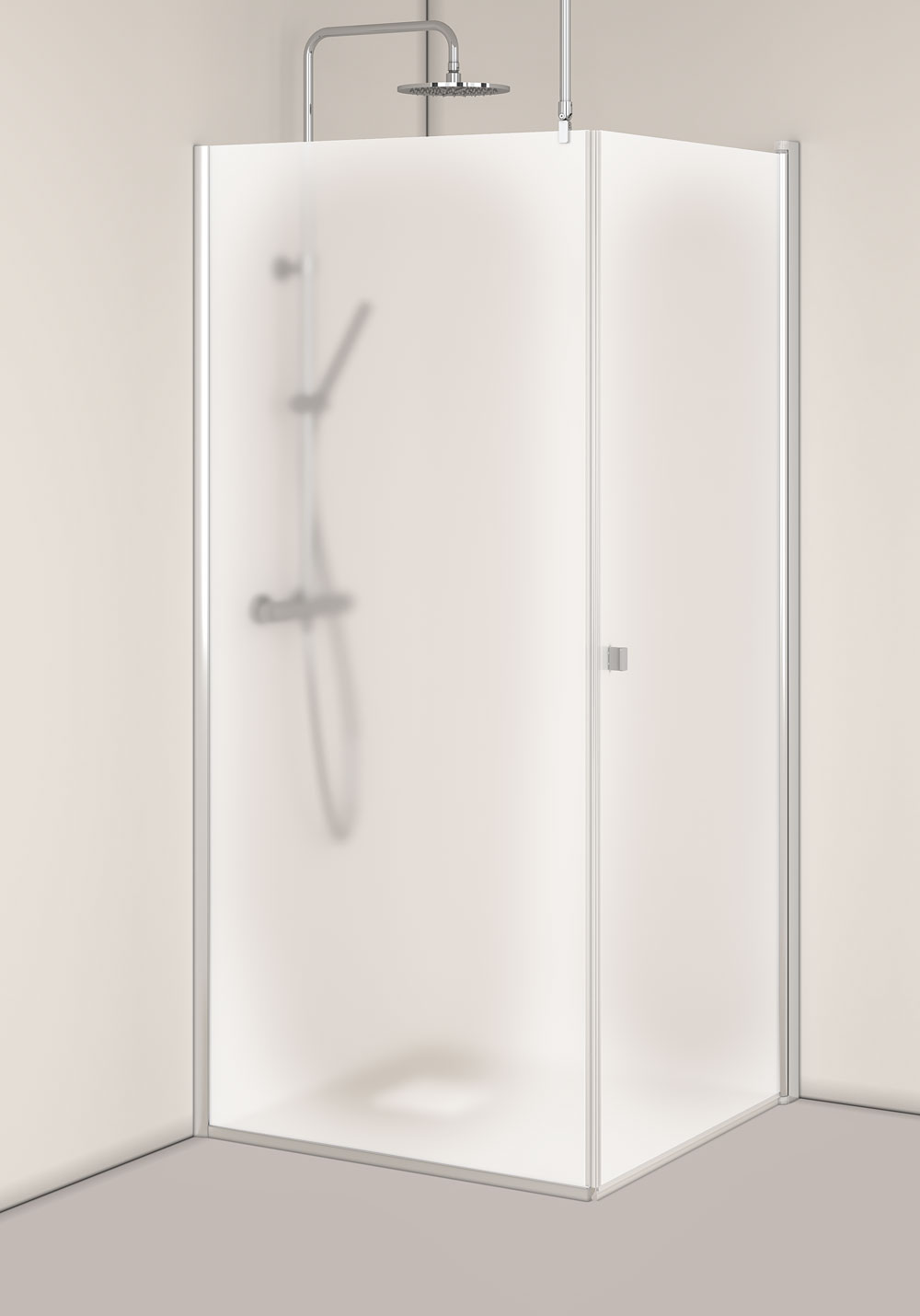 Quickly installed shower corner with a fixed screen and a hinged door in frosted glass. The shower is stable with wall profiles in anodised aluminum that can be mounted with a screw or glue trays. It has a patented solution for easy installation and adjustment, Hafa's InstaQuick ™. The door has lifting hinges so that it does not touch the floor when opened and is reversible. The shower rail can be fitted in three ways: against the wall, against the ceiling or at an angle against the same wall as the shower. The door has 6 mm toughened safety glass and can be mounted with surface-mounted pipes, 35 mm. The screen has 8mm toughened safety glass and an extension profile can be purchased for surface-mounted piping. Height 2000 mm. 22 mm door seal, magnetic strip and handle included.