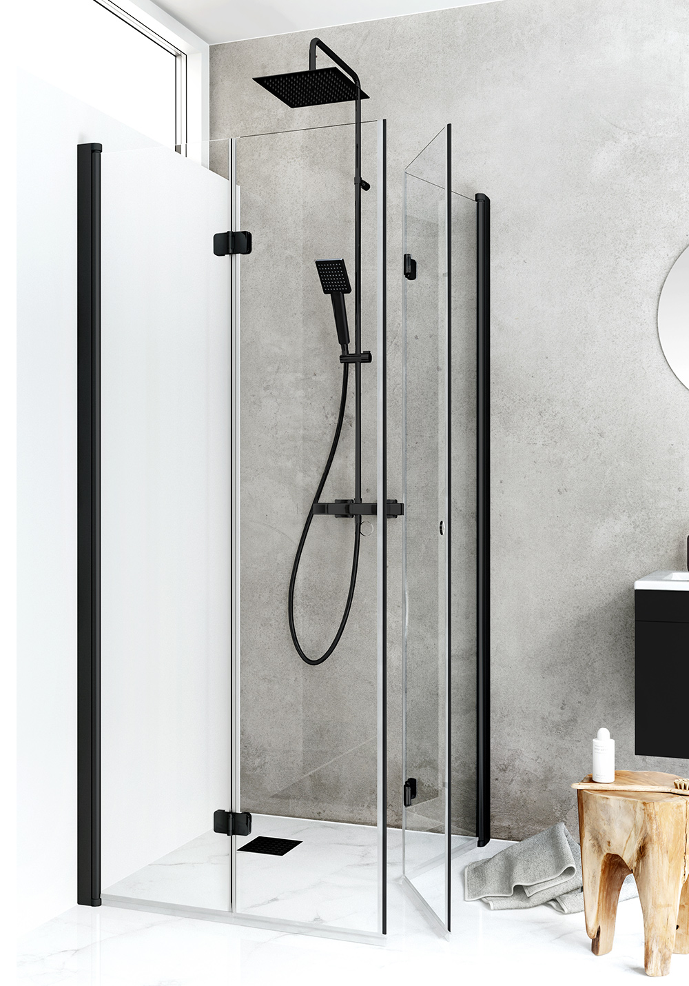 Shower encolusure with foldable doors in clrear glass that can free up space and make it possible with a smart solution for the small bathroom where it can be difificult to fit a traditional corner encoluser. The foldable door can easily be folded into the wall when not in used and creates a practical solution also for when toilet or bathroom furnture is close to the shower area. The shower corner is sturdy with wall profiles in eloxated or black painted aluminum that can be mounted with screws or using glue plates. The corner has a patent filed solution for easy installation and adjustment, Hafa's InstaQuick™. The doors has lifting funtion to ensure the do not collide with the floor when opened and are reverible so you can choose what wall to mount onto. The shower door can be combined with other componentes in the IglooPro series. 6 mm safety glass. Height 2000 mm. Can be mounted where visible piping is presend, 35 mm. 22 mm gasket, magnet enclosure and integrated handles are included.