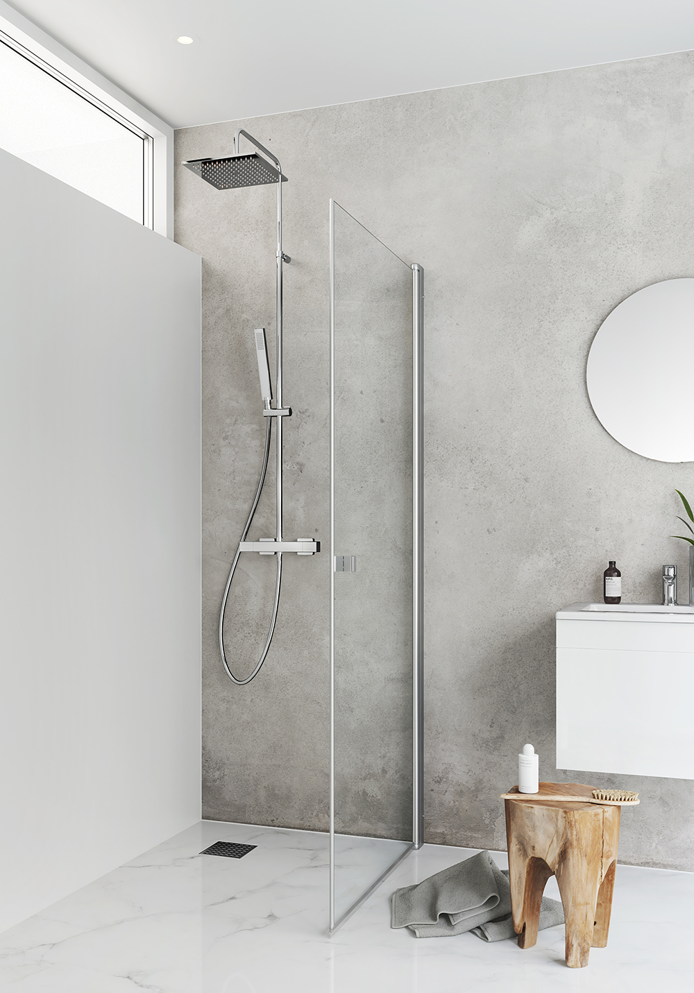 To facilitate the cleaning of shower doors and shower walls, the showers have large smooth surfaces and profiles without deep grooves. Discolouration is removed using citric or tartaric acid, rinse thoroughly afterwards. Limescale stains are removed using household vinegar warmed to 50 degrees: Rub it in, let it act, rinse away. Repeat for tough stains. Use rubbing alcohol to remove grease stains.