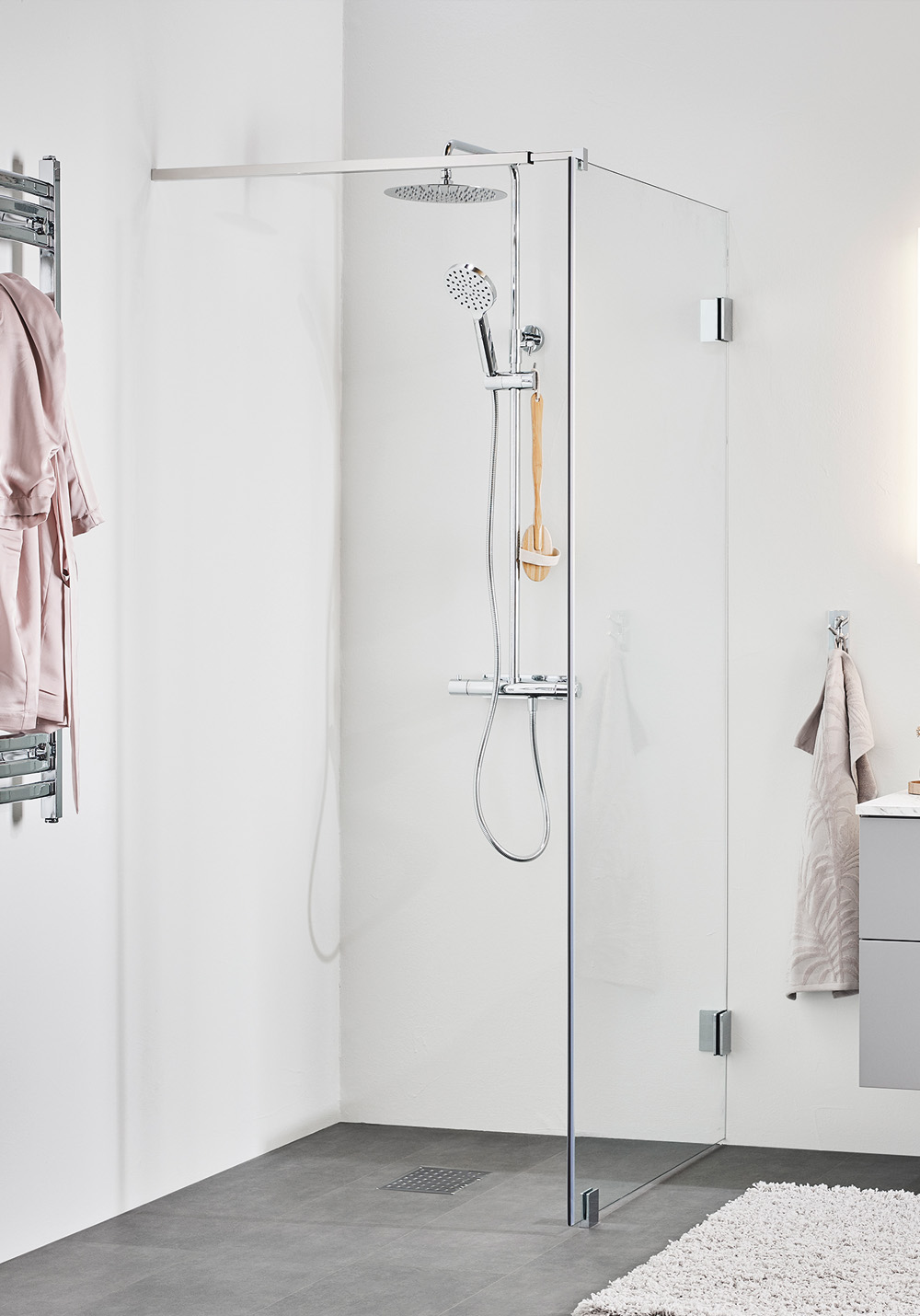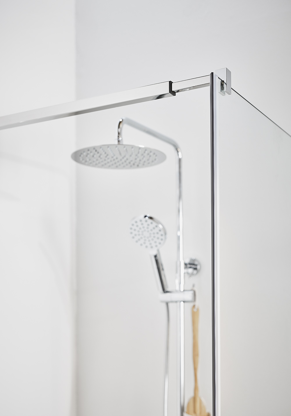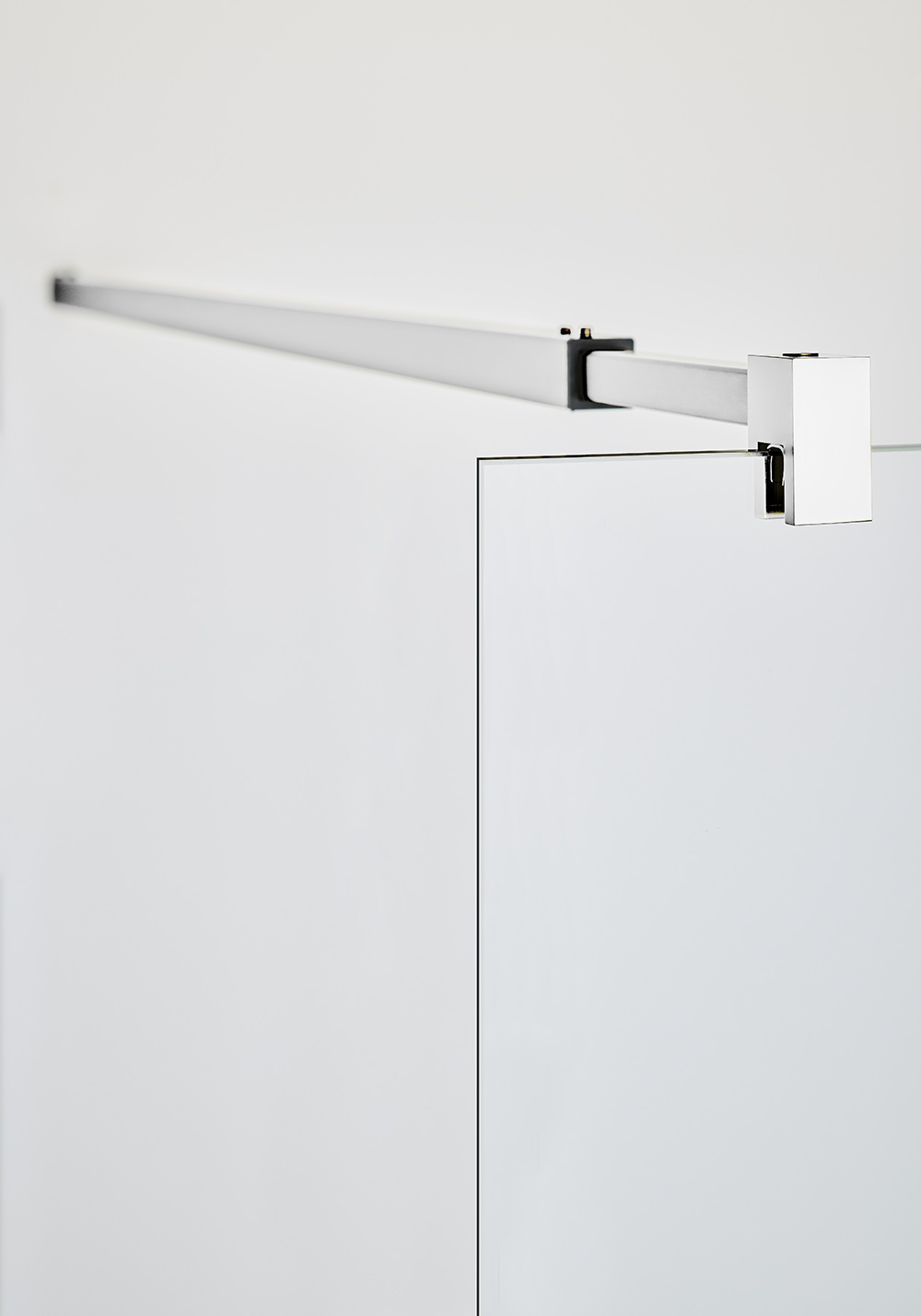 Exclusive showerwall with neat hardware and an elegant shower curtain rail. Choose between three colors, chrome, matt black or brass. The large glass surfaces gives an airy impression and creates a delightful space in the bathroom. The corner is composed by a door and a wall. The wall is reverible so you can choose what wall to install it on. The wall can be combined with doors in the Infinity series or complement it with a beatuiful shower curtain for a more comfy and luxurious shower enclosure. Please note that Infinity does not come with gaskets as standard, and hence, a good slope on your floor is crucial. Magnet gasket is included. Full height 2000 mm and with 8 mm safety glass.