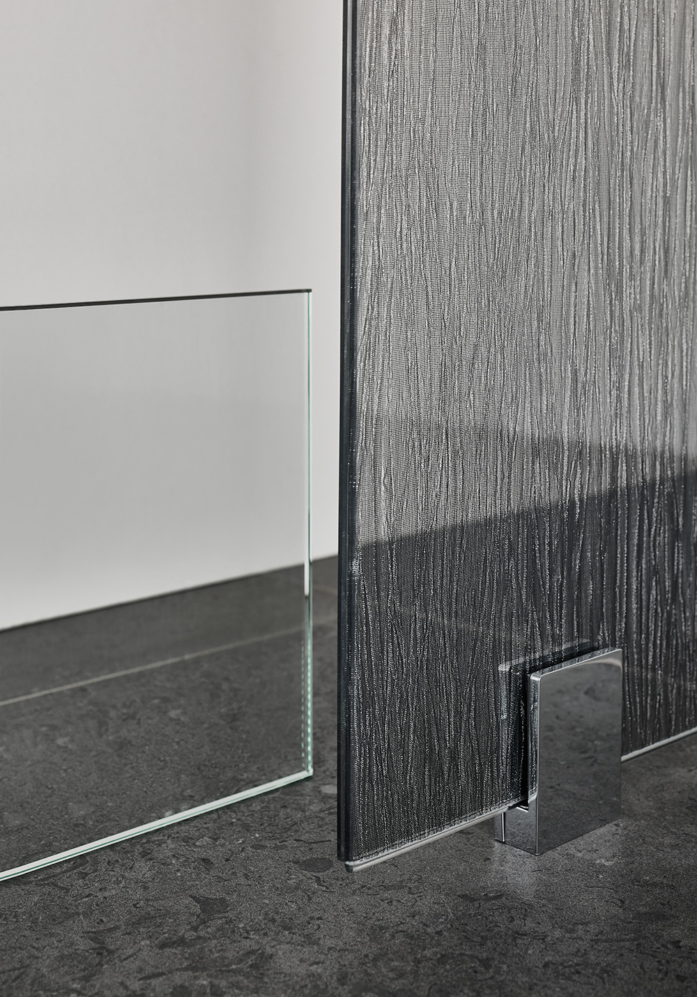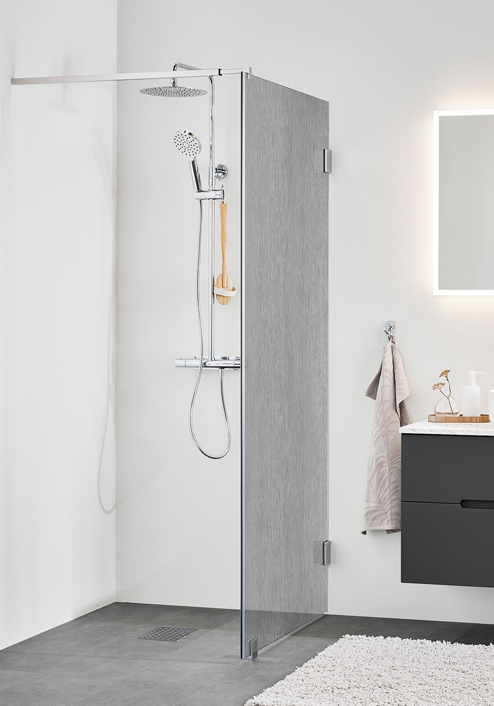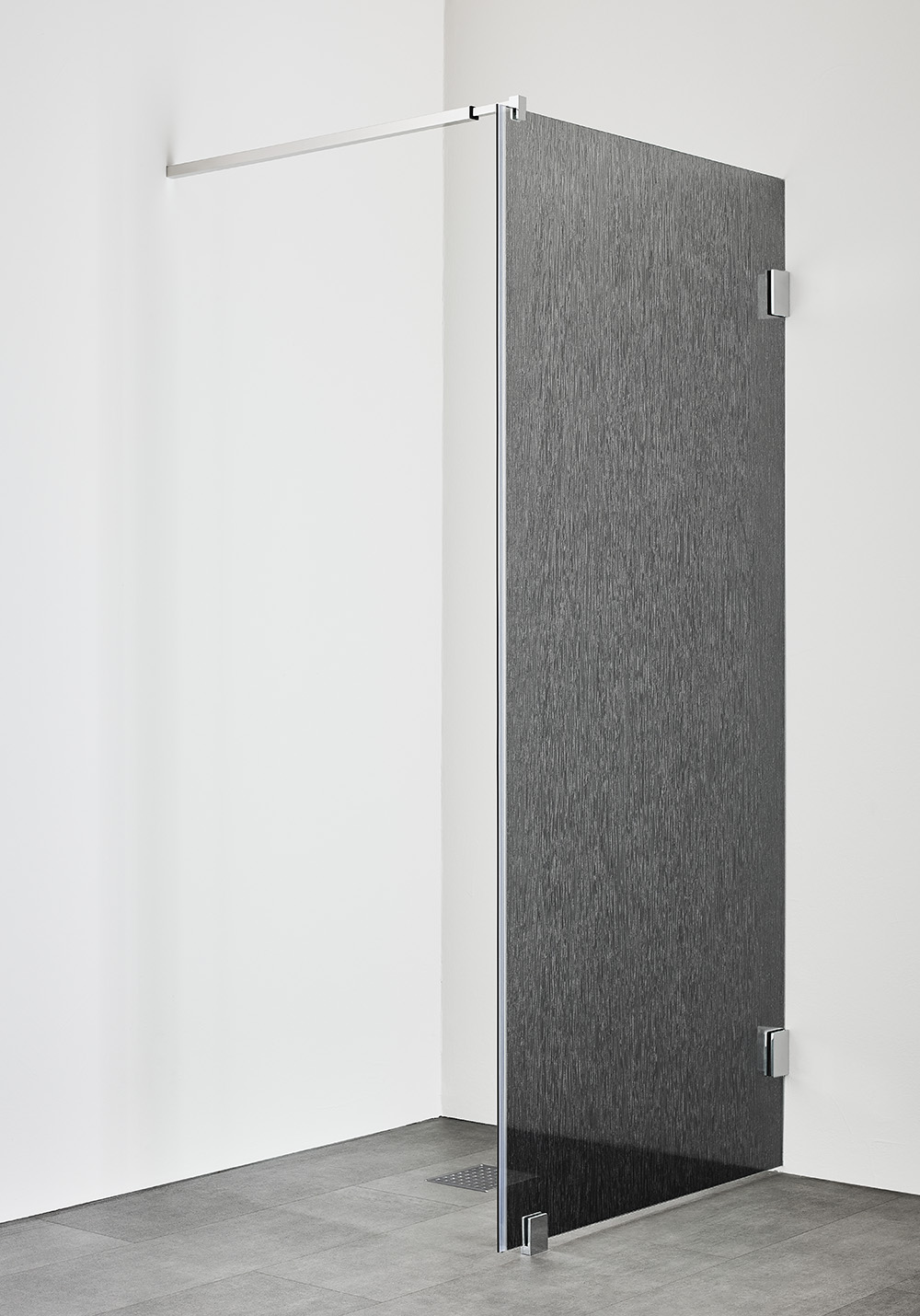 Infinity is an exclusive shower enclosure with sleek fittings and an elegant drapery bar. Choose from three colours - chrome, matte black or brushed brass - and from clear glass or Lace glass with a metallic textile effect. The large areas of glass give an airy feel and create a wonderful sense of space in the bathroom. The wall is reversible so you can choose which wall to install it on. The shower wall can be combined with doors from the Infinity series or supplemented with a beautiful shower curtain to create a cosy and luxurious shower. Keep in mind that Infinity does not have sealing strips as standard, so a correct floor drop is extra important. 8 mm tempered safety glass. Magnetic strip included. Full height 2000 mm and with 8 mm tempered safety glass.