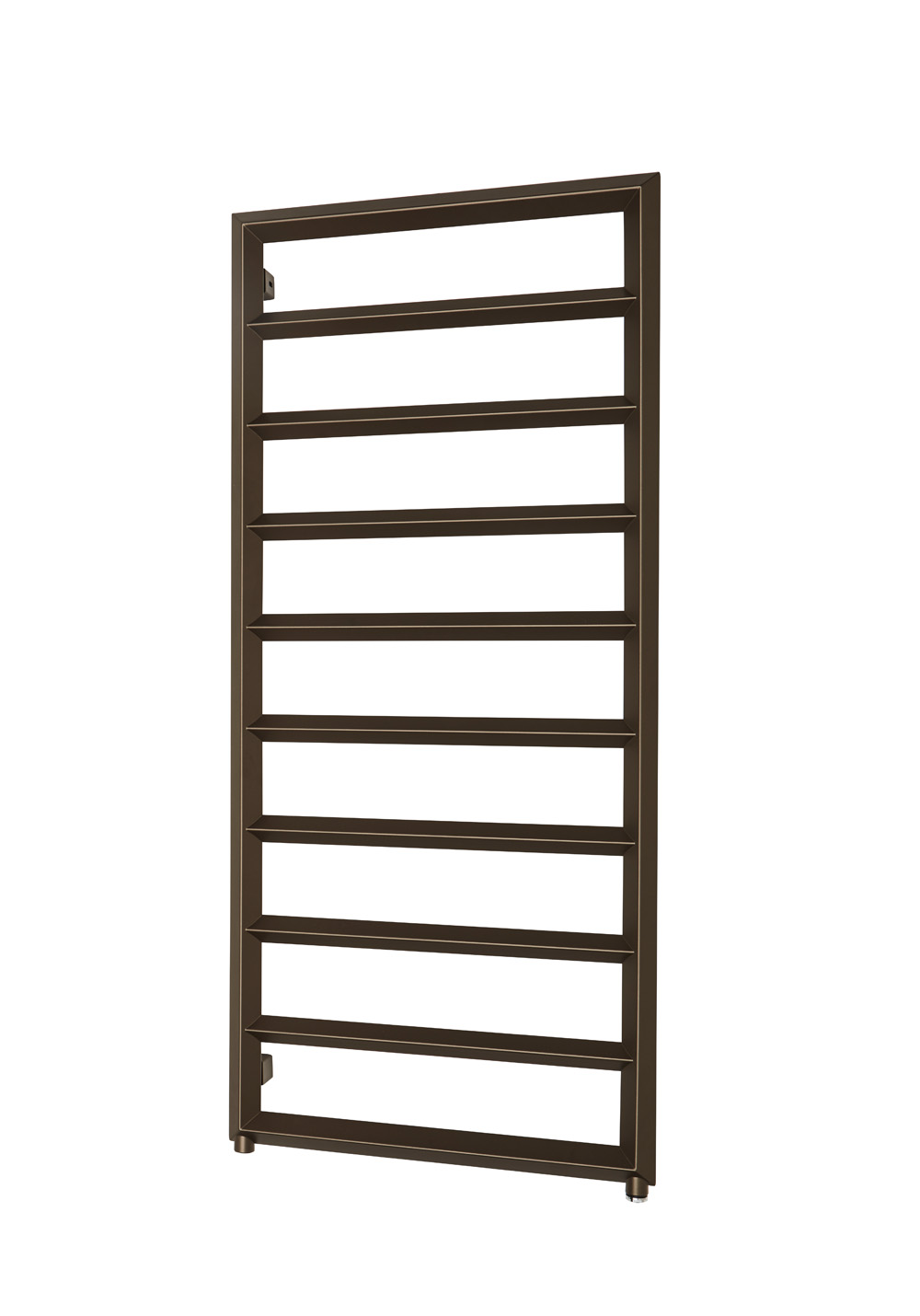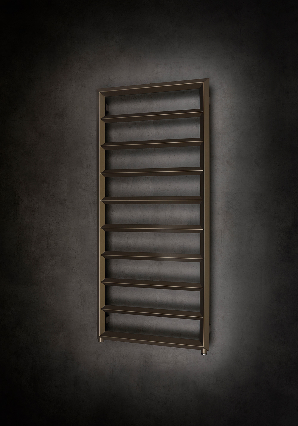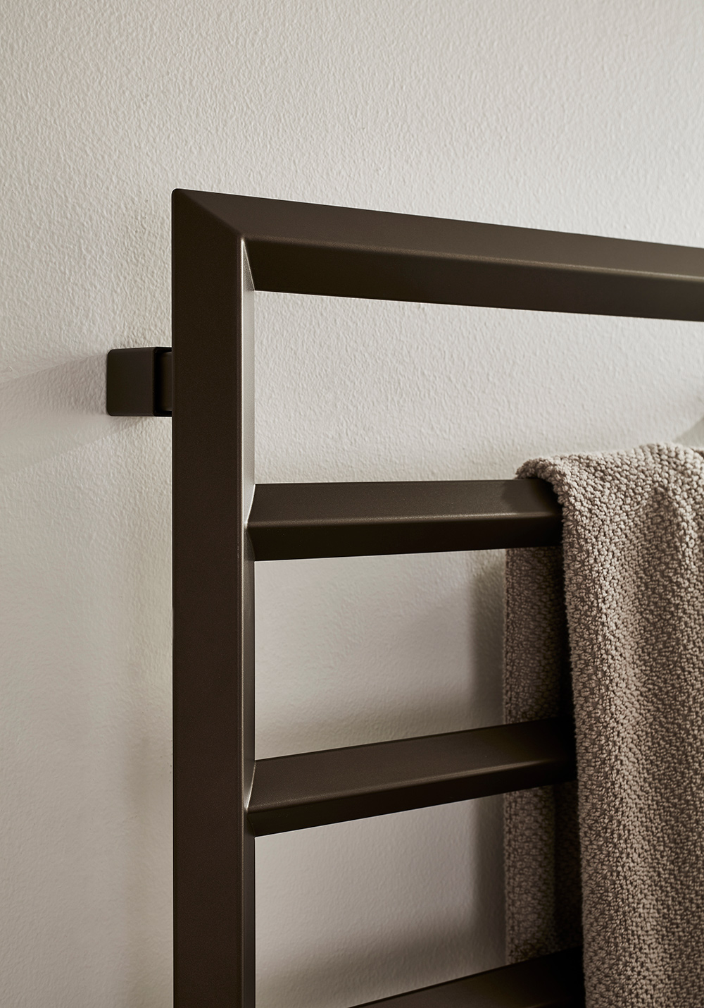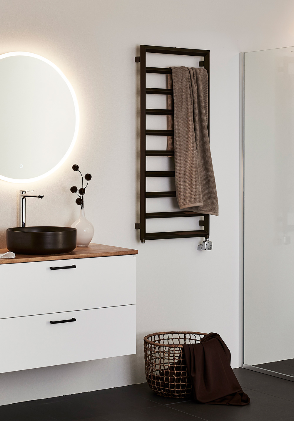 An elegant towel warmer in a new shimmering coffee color and with great care in the details. It has plenty of space for towels to dry properly. You connect it to your existing closed water system. Also connect an electric element to the electricity grid to be able to regulate the heat all year round.