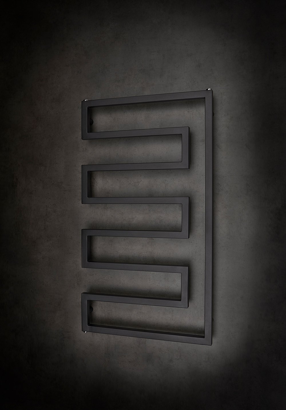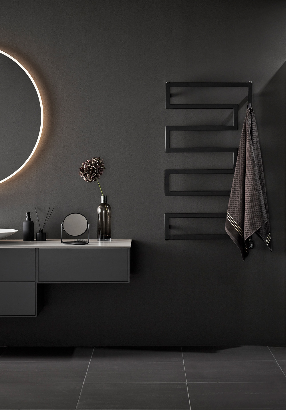 A water-filled towel warmer with a unique design that you connect to your existing closed water system. Finished in an anthracite grey colour with a beautifully textured matte surface. You can buy an Add hook to make space for more towels or your bathrobe. The towel warmer is reversible. Connetct an electric element to the electricity grid to be able to regulate the heat all year round. Immersion heater and one-hole valve cannot be combined in this model.