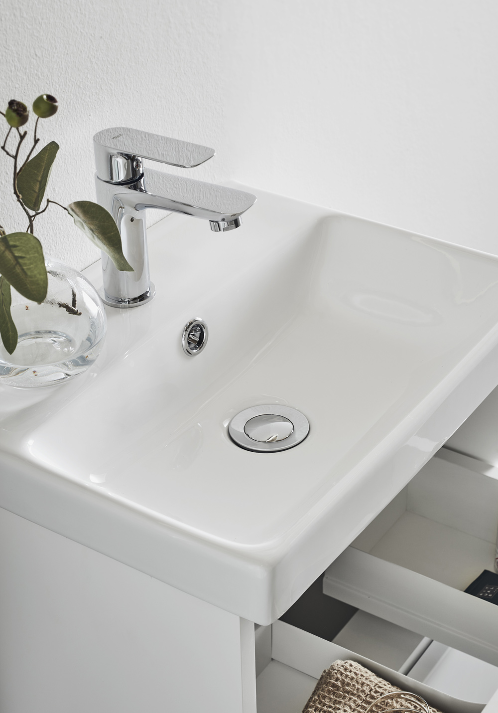Elegant and slim basin in porcelain wiht overflow protection. Complement with wast pop up. We do not recommend a waterfall faucet for this basin model.